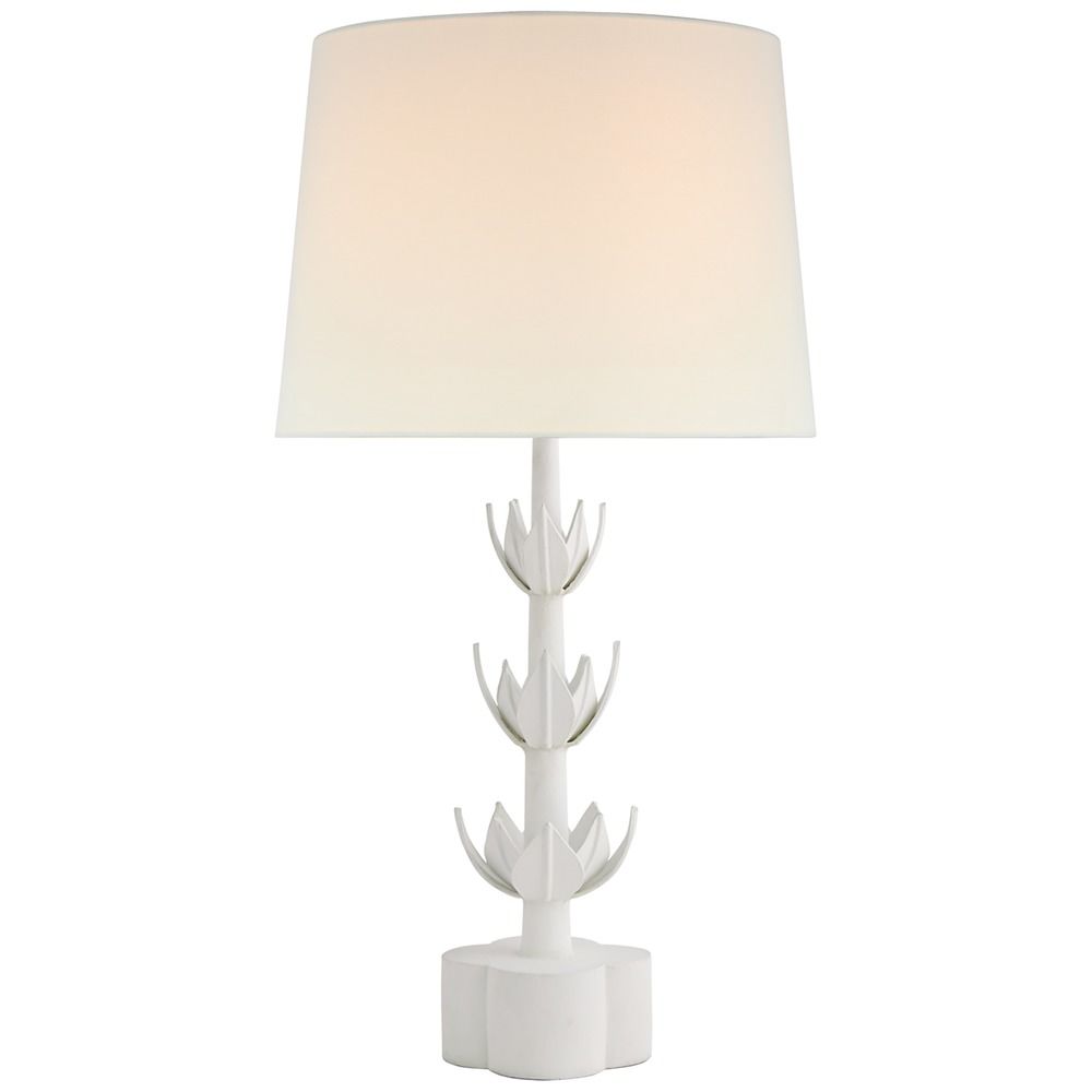 Add softness and light to your bedroom or living space with Julie Neill's Alberto Large Triple Table Lamp by Visual Comfort. The Alberto features a thin body in a Plaster White finish, with water lily-style floral details. It also features a tapered Linen shade. The Alberto requires one 100W maximum medium base A19 light bulb, which can be dimmed with the lamp's integrated dimmer.