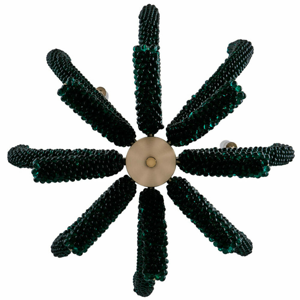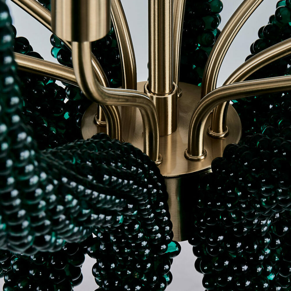 The chandelier's open, airy composition lends it a sense of movement and lightness, bringing both texture and refinement to any space. While the glass beads display a gentle green hue, the light they emit remains soft and neutral, ensuring a warm and welcoming glow. The Brushed Champagne Gold finish envelops the piece in quiet luxury, enhancing its natural elegance. Ideal for dining rooms, living spaces, or entryways, the Coral Chandelier brings an artful blend of organic beauty and sophisticated craftsmanship to contemporary interiors.
