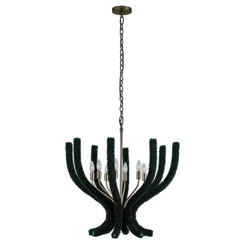 The Coral Chandelier by Kalco Lighting captures the poetry of nature through an elegant, sculptural design. Inspired by coral branches and the delicate sparkle of raindrops, it features slender, organic arms adorned with transparent or soft green glass beads. Each bead, perched gracefully along the frame, acts like a magnifying lens, refracting light to create a subtle, shimmering effect that evokes the feeling of water glistening in sunlight.