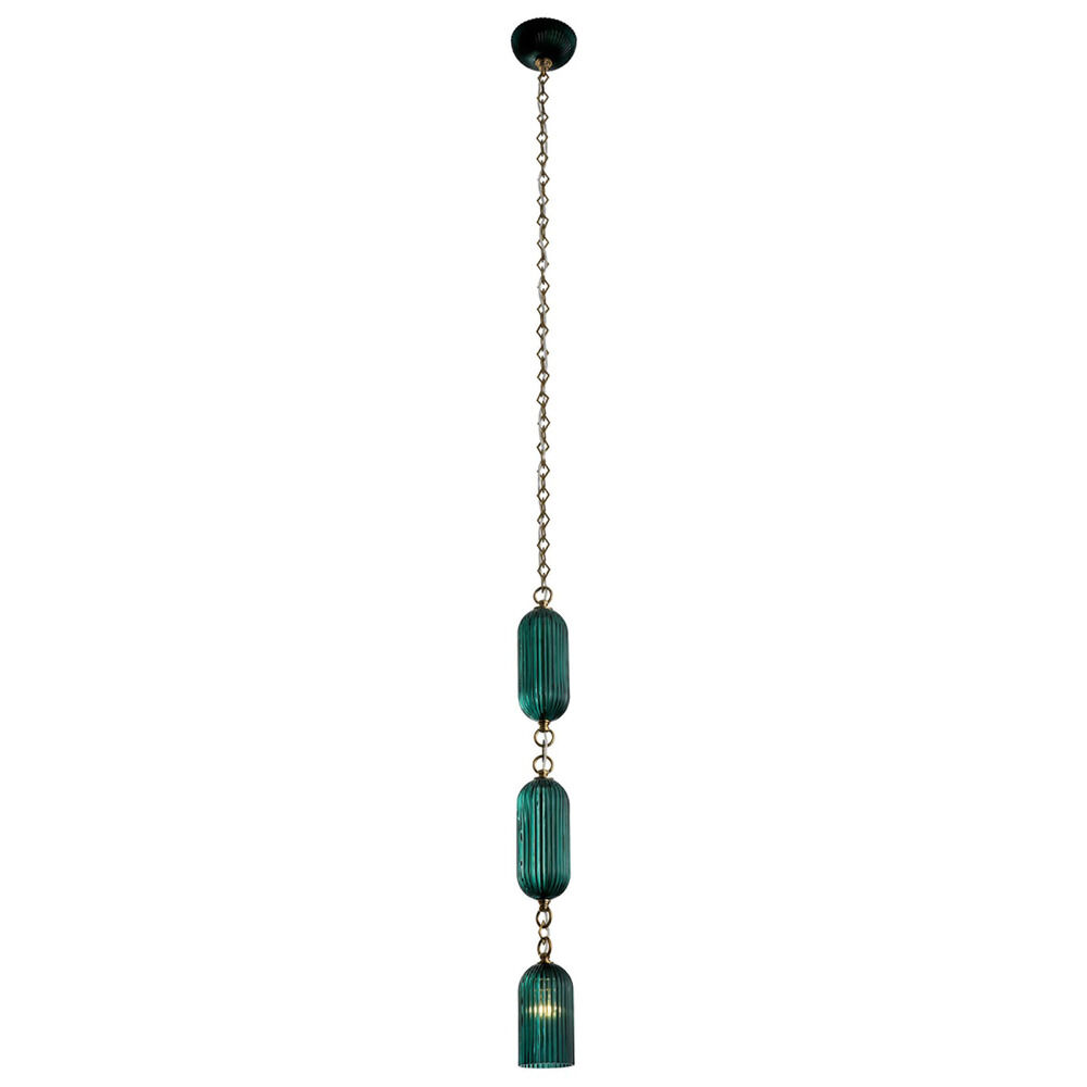 Captivating Peacock Green glass creates the ultimate accent color with a bold style statement. This classically inspired silhouette uses a repeated reeded pattern to create texture from the Satin Brass frame to the glass shades.