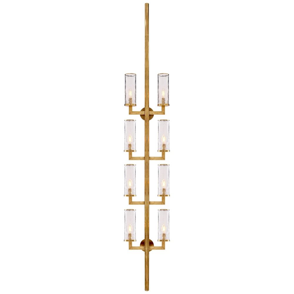 Update your living space with Kelly Wearstler's Liaison Statement Sconce by Visual Comfort. The Liaison features a long, vertical style - simple yet sophisticated. This fixture has cylindrical, clear crackle glass, as well as an Antique-Burnished Brass finish. The Liaison requires eight 60W maximum candelabra base C11 light bulbs. Clear or vintage bulbs are recommended. This fixture is rated for Damp Location.
