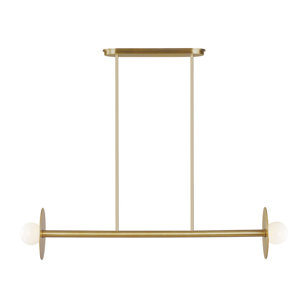 Kelly Wearstler Nodes burnished brass medium linear chandelier. Contemporary design with strong, durable steel frame showcasing the delicate mouth-blown milk white glass diffuser. An excellent choice in dining areas, entry halls, kitchen Islands, great rooms, and more. Measures 41 1/8-inches long by 8-inches wide by 8-inches tall. Damp location rated. Illuminated with 2 halogen G9 T4 60W max. 120V bulbs (not included). For a more energy-efficient and eco-friendly design, consider using dimmable LED G9 T4 bulbs (sold separately). Supplied with 8 12-inch stems, 2 6-inch stems, 180 inches of wire, and hangs 61 ½-inches overall.