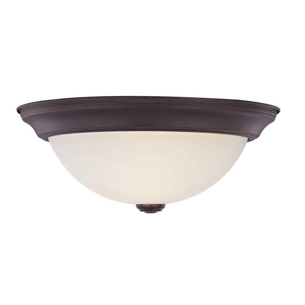 Transitional royal bronze 2-light indoor ceiling light with satin white glass shade. Flushmount two pack. Requires two 10-watt LED medium base light bulbs. Suitable for installation in dry and damp locations. 120 volts line voltage. UL / CUL certified. Two pack of two-light flush mount lights. (4) total bulbs required.