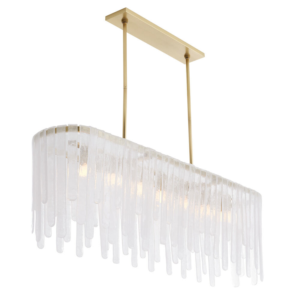 The Leighton Linear Chandelier by Arteriors Home is inspired by the beauty of Multnomah Falls. This oblong, oval chandelier features individual panels of clear seedy glass that suspend from its Antique Brass iron frame. The panels vary in size and are suspended at alternating heights, creating a sense of movement. Finish will vary. Additional pipe is available to order separately. The Leighton is rated for use in damp locations, although limited covered outdoor areas may affect its finish.