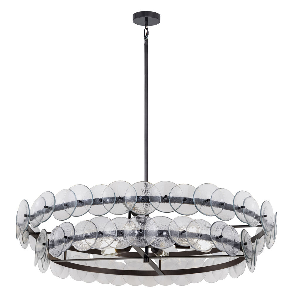 Maxim Lighting's Loren 42-Inch Chandelier captures the essence of Mid-Century Italian design with a harmonious blend of vintage elegance and contemporary refinement. Featuring overlapping handmade pressed glass disks, this striking fixture is artfully arranged on a sleek metal frame, creating a sculptural presence that enhances any space. The textured glass delicately diffuses light, reducing glare while casting a warm and inviting glow that adds depth and character to interiors.