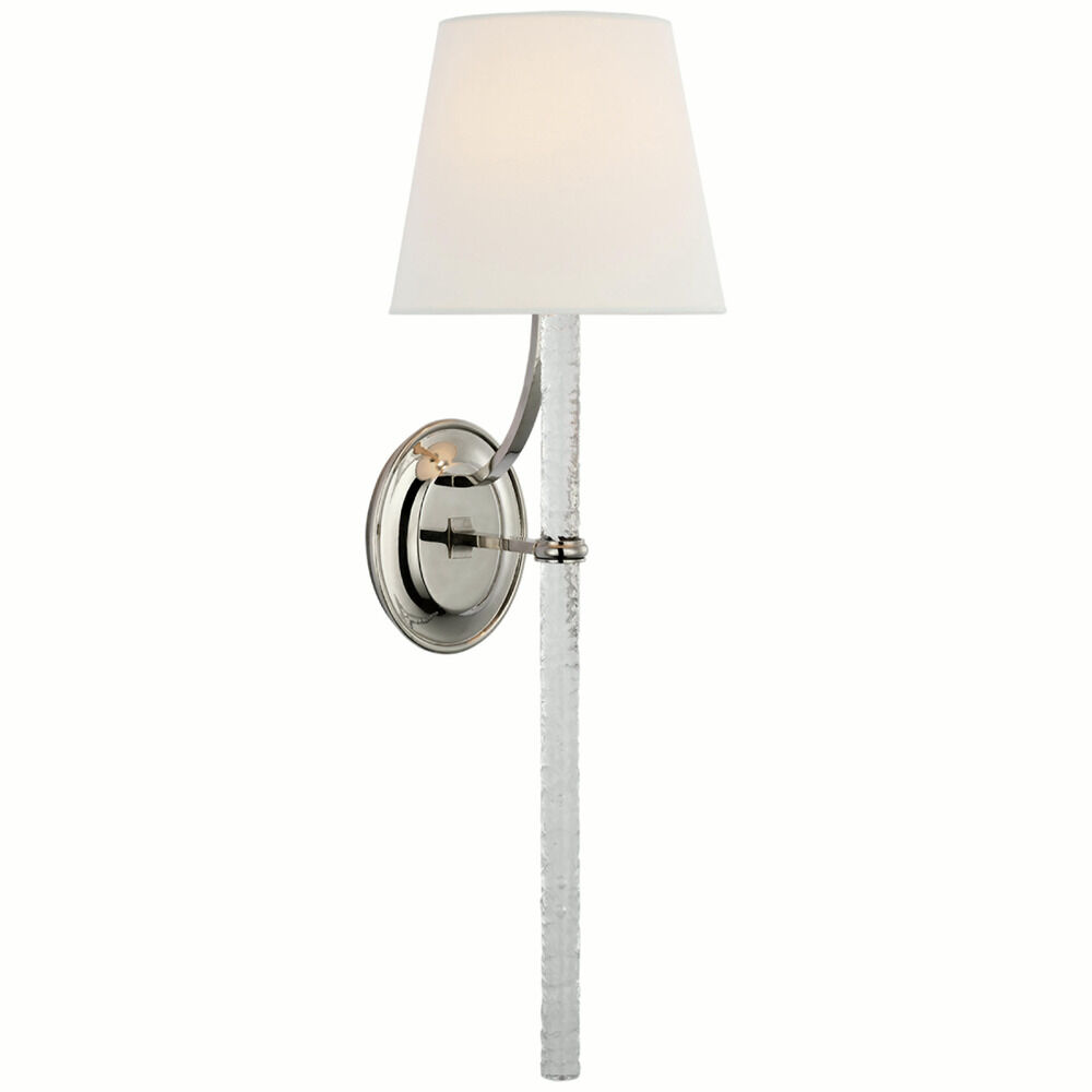 Add texture and elegance to your bedroom or living space with Marie Flanigan's Abigail XL Sconce. This wall mount features a shiny Polished Nickel finish and a clear, wavy glass rod beneath its Linen shade. Candelabra base light bulb not included.