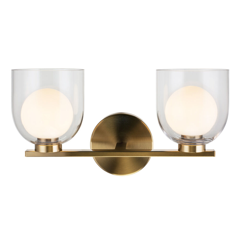Contemporary / modern aged gold brass 2-light bathroom light with clear & opal glass shade