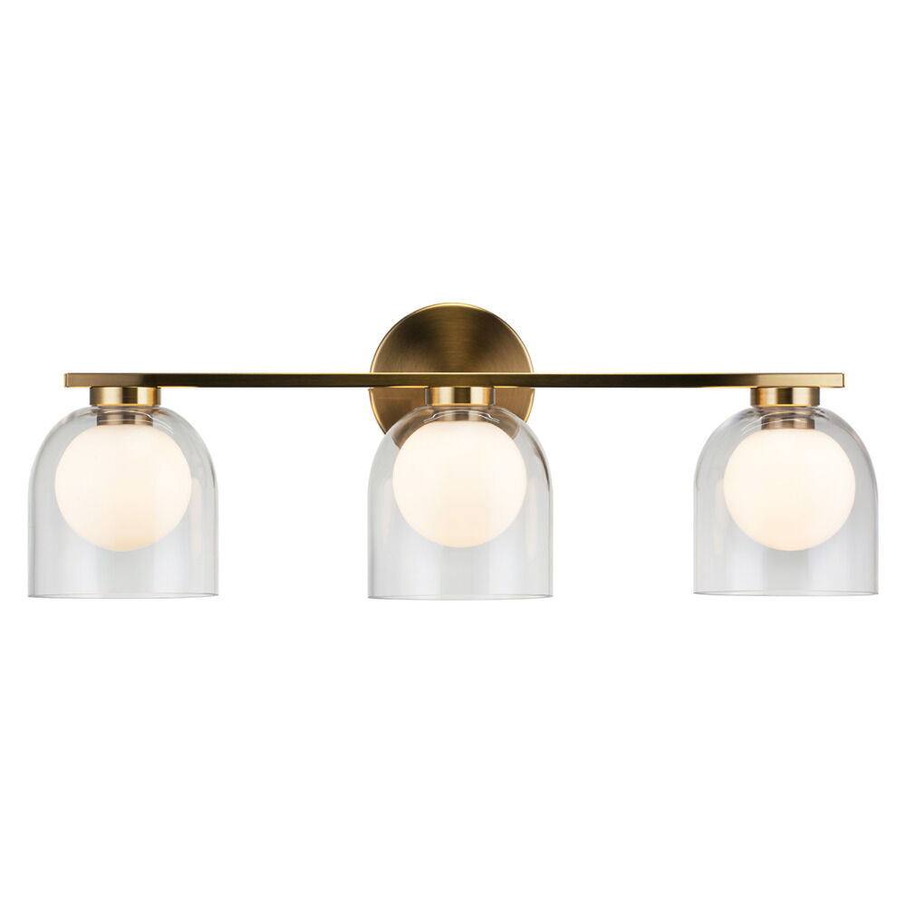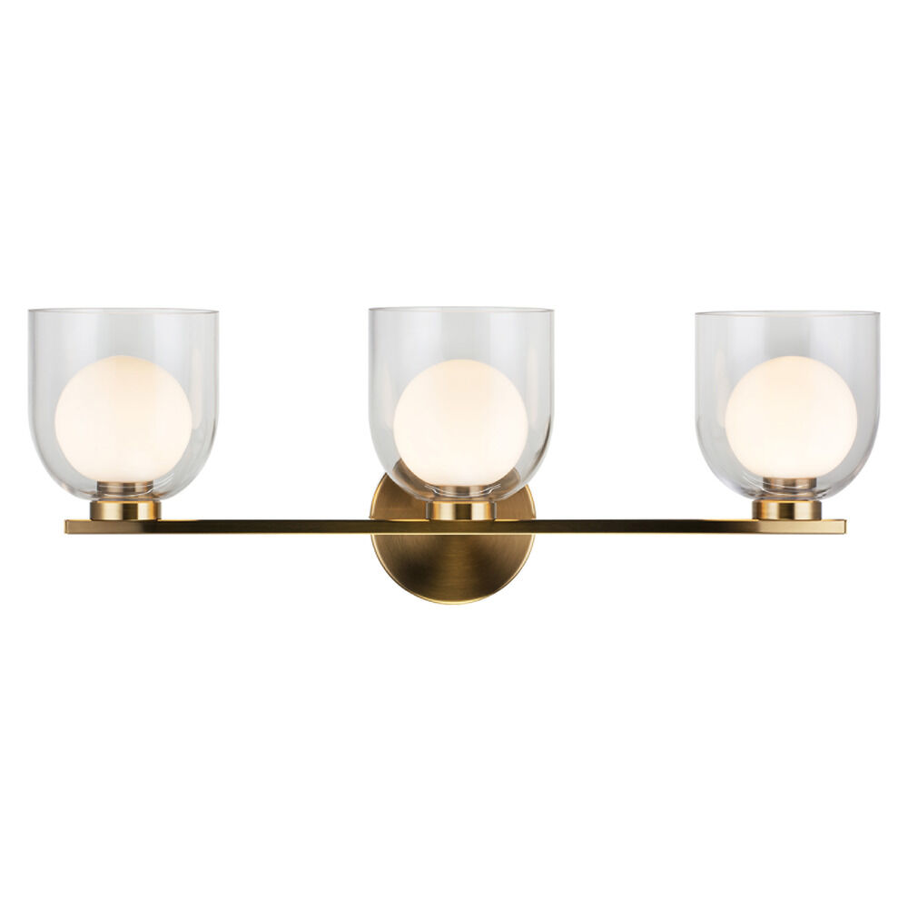 Contemporary / modern aged gold brass 3-light bathroom light with clear & opal glass shade