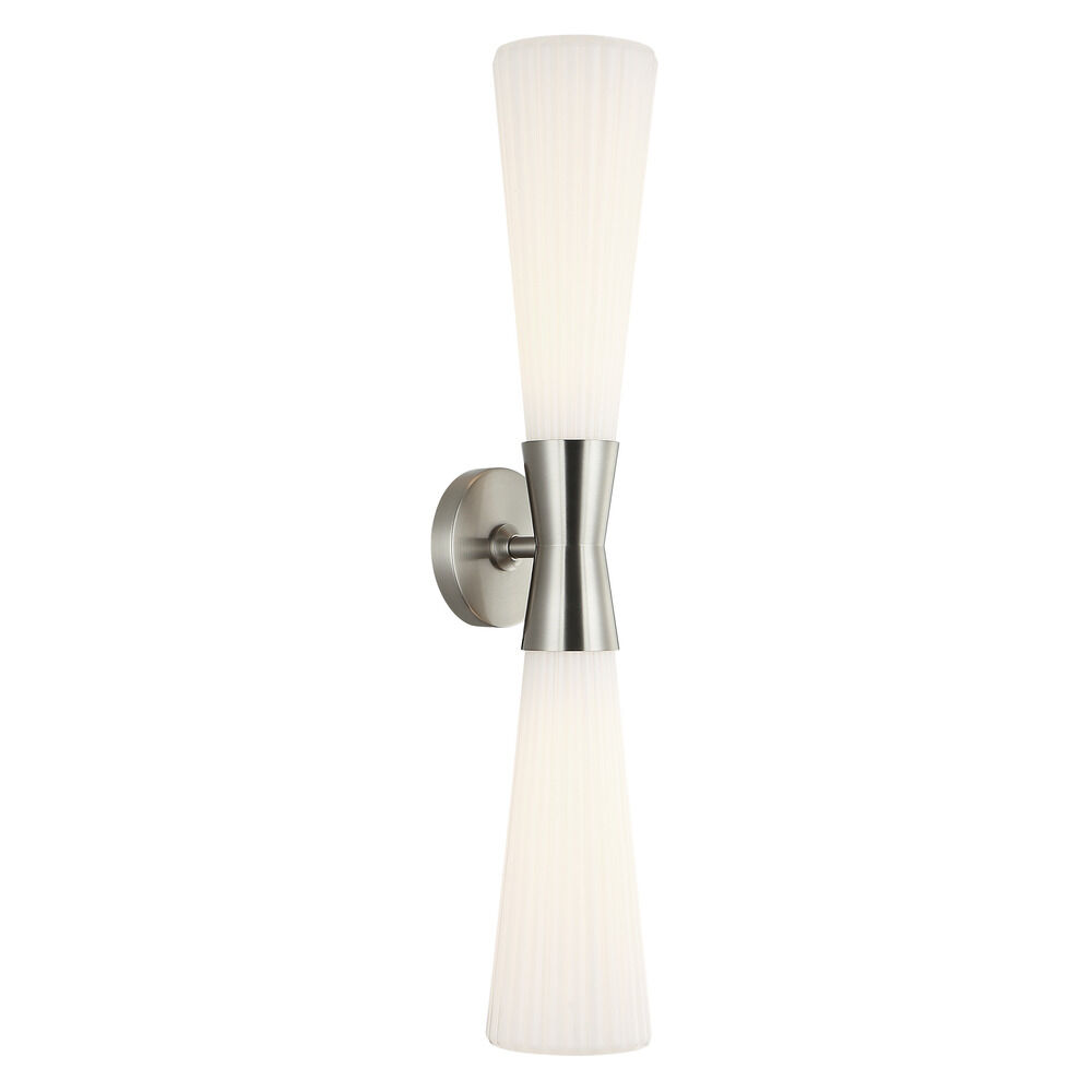 Contemporary / modern brushed nickel 2-light bathroom light with ribbed opal ribbed glass shade