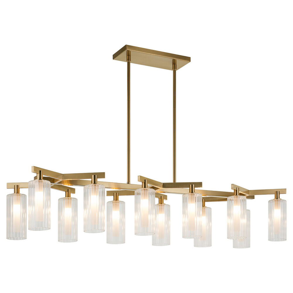 Contemporary / modern aged gold brass 12-light chandelier with clear,ribbed clear ribbed glass shade