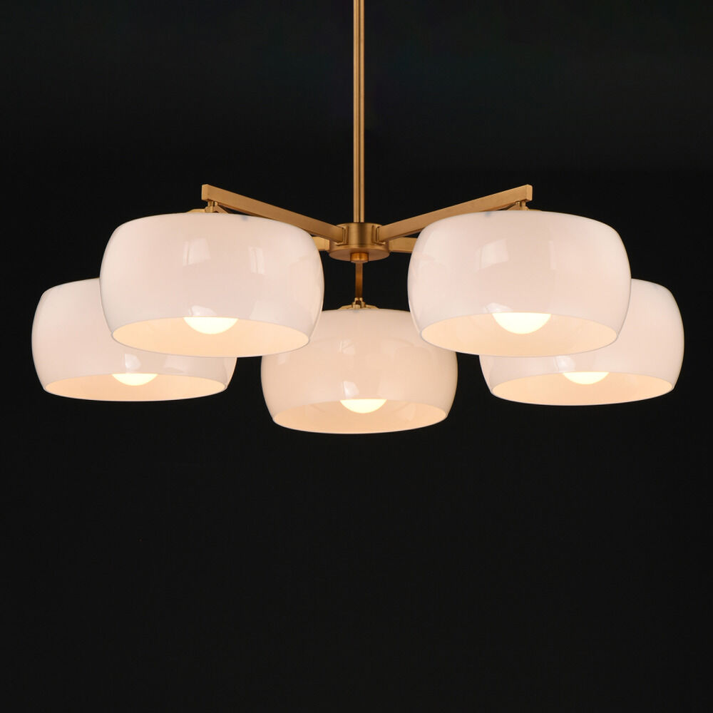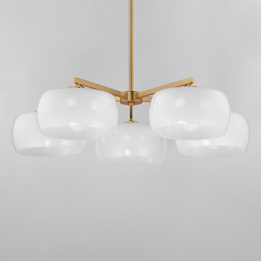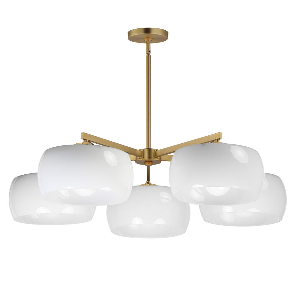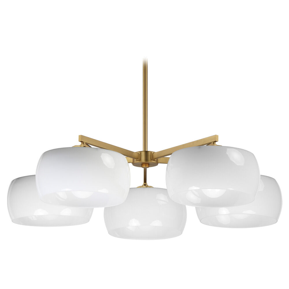 Contemporary / modern natural aged brass 5-light chandelier with glossy white glass shade