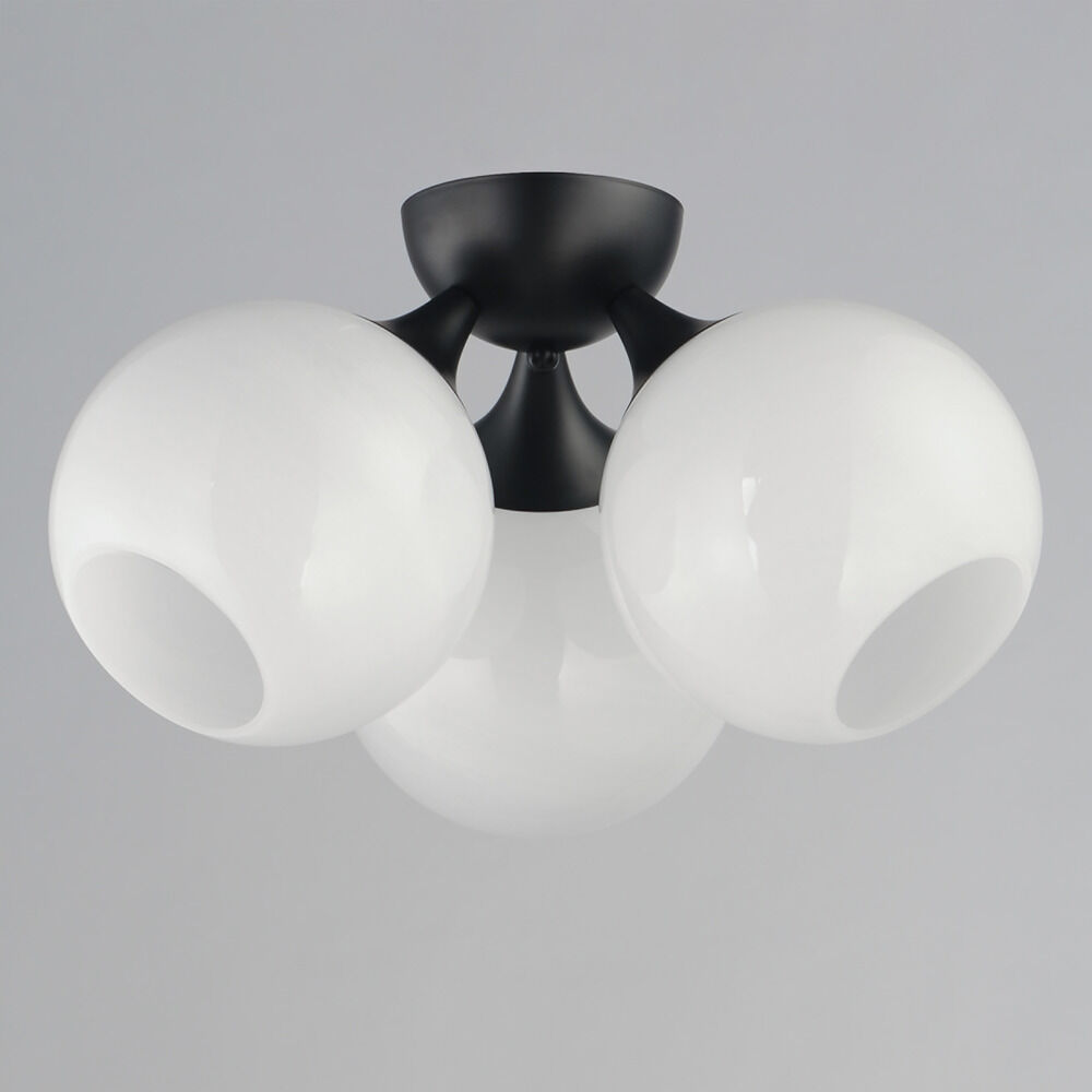 Mid-century modern black 3-light indoor ceiling light with swirling white marble glass shade