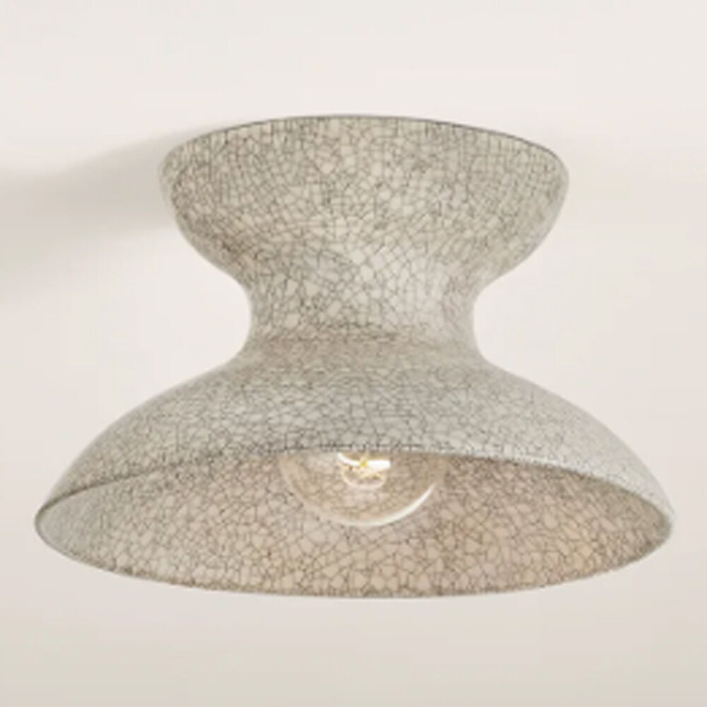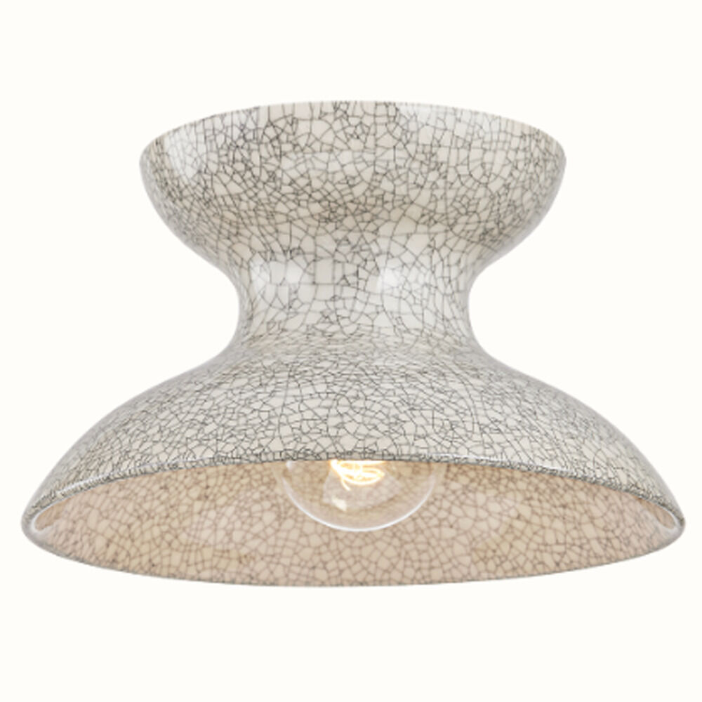 A contemporary take on a 1960s design, the Carina flush mount features a subtly organic shade shape with hidden Aged Brass-finished hardware. The glossy glazed Belgian Crackle ceramic finish softens the minimalist silhouette, making it feel warm and approachable. A perfect modern essential, this utilitarian, yet elevated fixture works well in a kitchen or dining space.