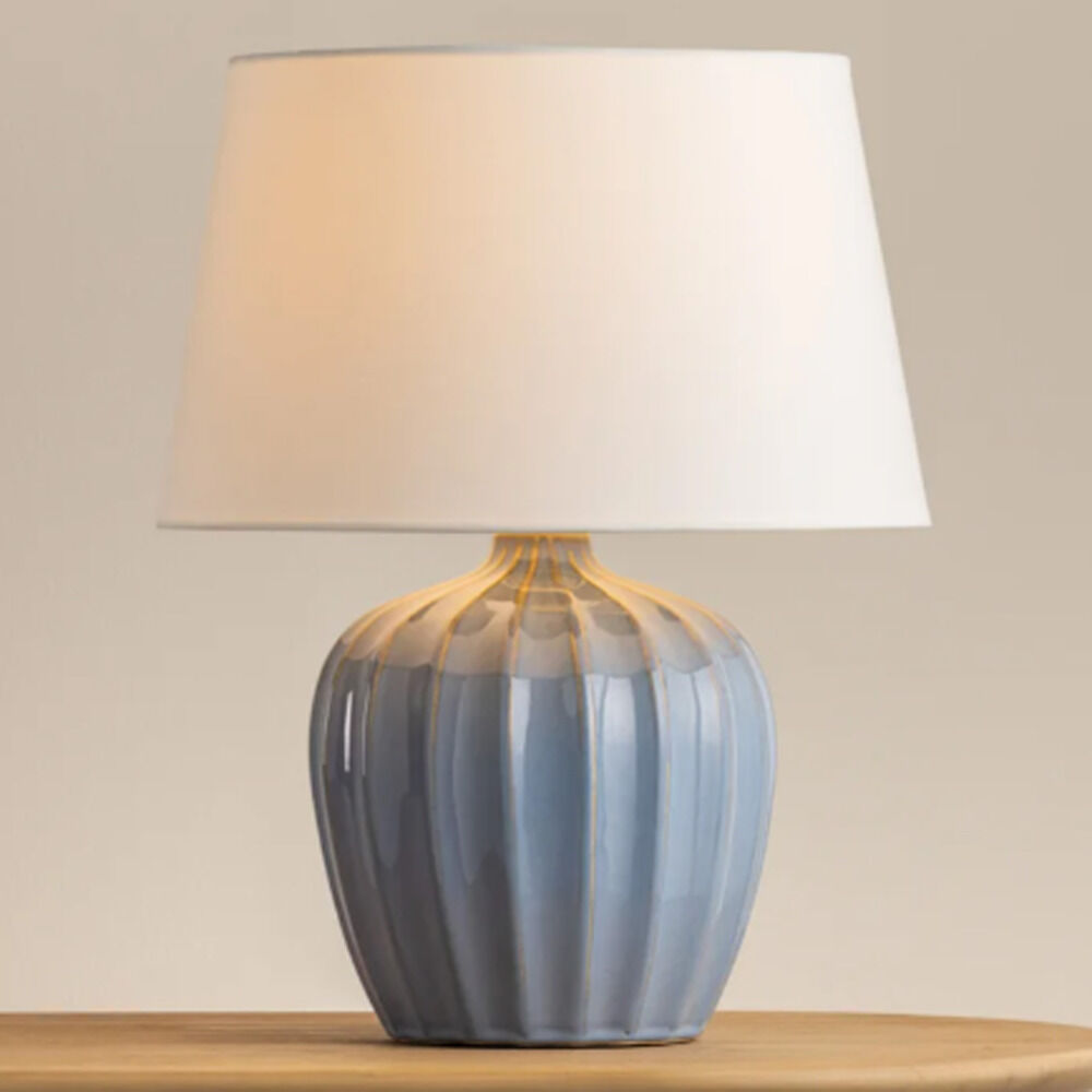 The petite and playful Myla table lamp is a true crowd-pleaser with a rounded base and a reactive more blue than green Spring Lake glaze. Vertical ribbing creates tonal variation, revealing an earthy undertone on the raised grooves. Topped with a white linen shade and finished with Aged Brass hardware, it's the perfect accent lamp for bedside use.