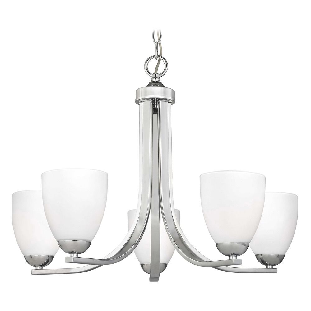 Chandelier in polished chrome with shiny opal white modern bell glass shades and five lights. Takes five 100-watt medium base frosted light bulbs (not included). Replacement glass shade is available. This chandelier comes with 6 feet of chain and 7 feet of wire that allows the overall height to be adjusted between 22-inches and 94-inches. Suitable for installation in dry locations only. 120 volts line voltage. UL / CUL certified.