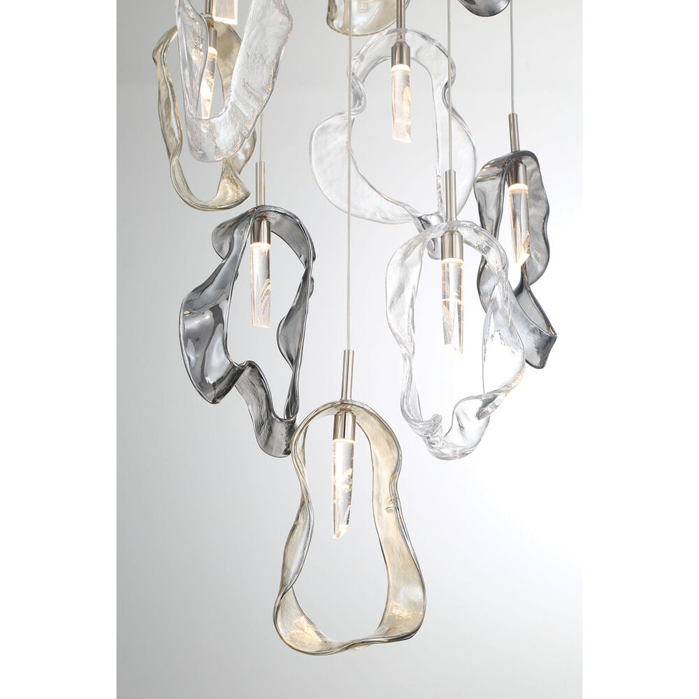 The Eurofase Lighting Norah 12-Light LED Multi Drop Chandelier is a breathtaking display of artistic contrast, where fluidity meets structure in a harmonious interplay of materials. Handmade, freeform glass ribbons twist gracefully around the rigid, arctic chisel of quartz crystal, creating a striking juxtaposition of organic movement and sharp precision. This dynamic composition captures light in mesmerizing ways, producing layers of reflection and refraction that bring depth and dimension to any space.