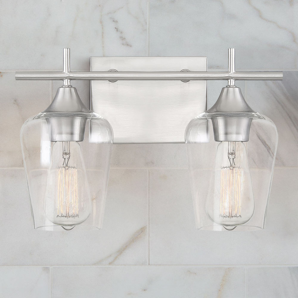 Bold, light-colored lines and a streamlined silhouette create an air of elegance and sophistication. The lustrous, brushed, satin nickel finish and clear glass shades go with absolutely everything: any color palette and many other finishes. Whether you have transitional, contemporary, bohemian, or other decor styles in your bath, you'll love the way this Octave fixture stylishly blends in. The bath bar is 14'' wide, 9'' high, and extends 5.5'' from the wall. The curved glass shades have a graceful, uncluttered look, and two 60W, E-style bulbs provide lovely light above the vanity. Plus, it may be mounted as either uplight, or downlight; a sleek, clean choice for your bathroom or powder room.