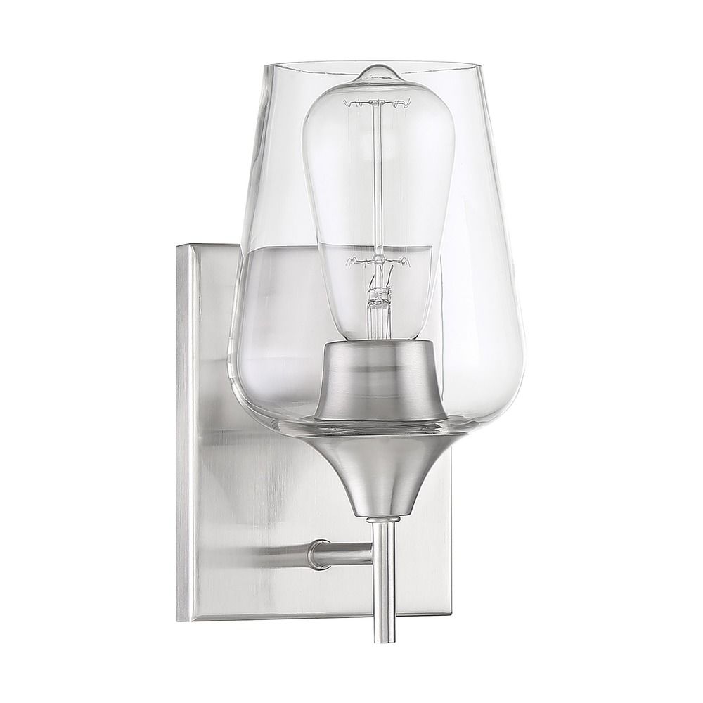 Bold, light-colored lines and a streamlined silhouette create an air of elegance and sophistication. The lustrous, brushed, satin nickel finish and clear glass shade go with absolutely everything: any color palette and many other finishes. Whether you have transitional, contemporary, bohemian, or other decor styles in your home, you'll love the way this Octave fixture stylishly blends in. The sconce is 5'' wide, 9.5'' high, and extends 6'' from the wall. The curved glass shade has a graceful, uncluttered look, and one 60W, E-style bulb provides lovely light. You'll want to cluster several of these together for clean, casual style in your dining area, living room, kitchen, entryway, bedroom, bathroom, office, family room, or hallway.