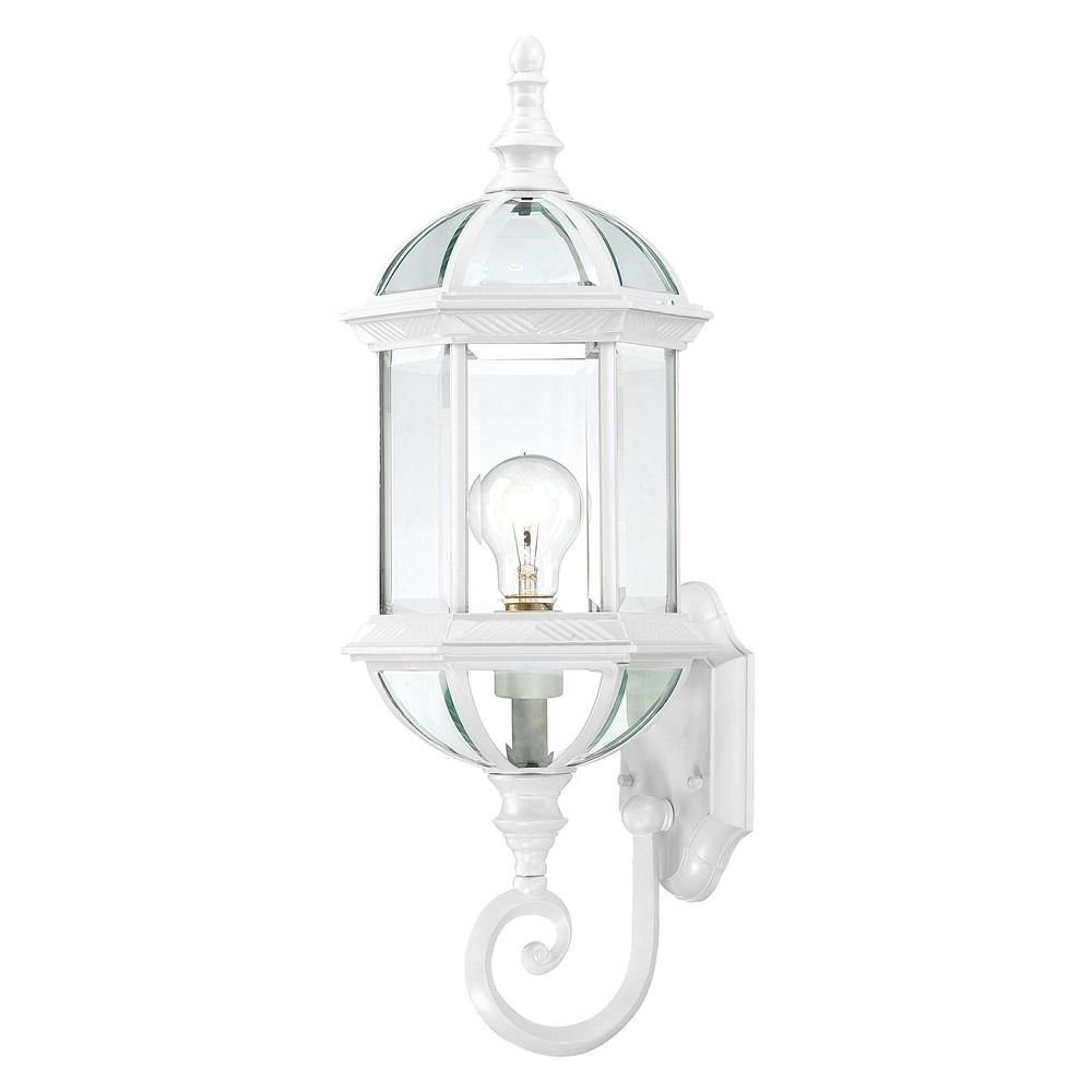 Traditional white 1-light outdoor wall light with beveled clear beveled glass shade