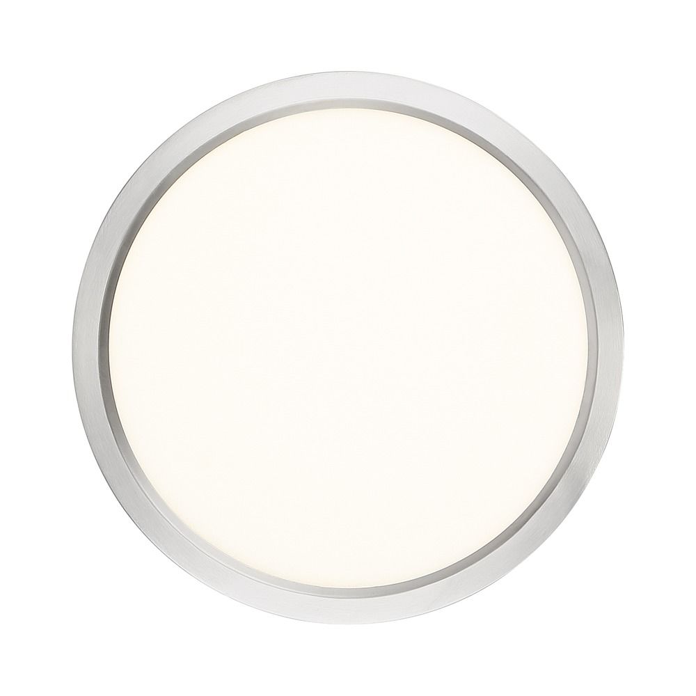 Contemporary / modern brushed nickel LED flushmount light with white acrylic shade. Includes integrated LED module that runs off of 15-watt, 1300 lumens, 3000K color temperature that is equivalent to 85-watt incandescent. Suitable for installation in dry locations only. 120 volts line voltage. ETL certified.
