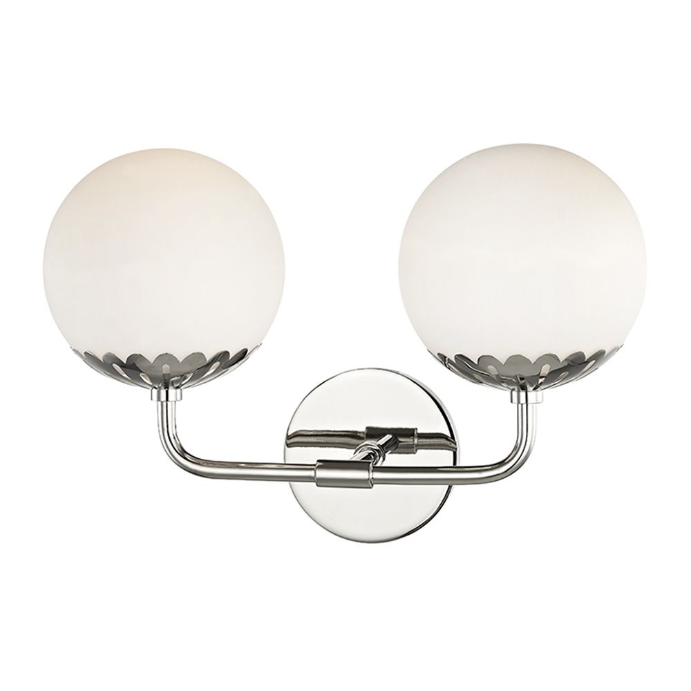 Mid-century modern polished nickel 2-light bathroom light with glossy opal glossy glass shade