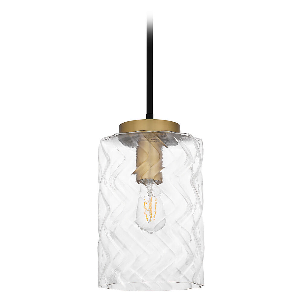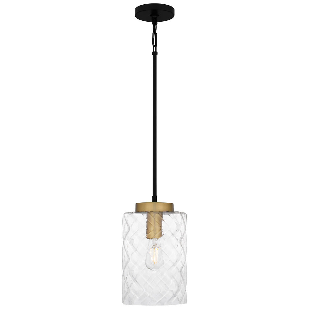 Contemporary / modern matte black & aged brass 1-light mini-pendant light with clear,textured clear glass shade