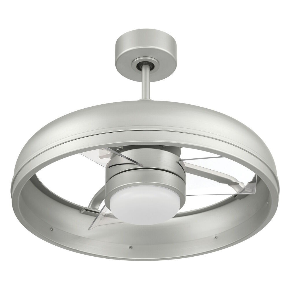 Transitional painted nickel 1-light indoor ceiling fan with frost white shade and clear acrylic blades. Rated for both indoor and outdoor use. One 6-inch downrod included. Included LED light kit is optional. Optional lens cover is also included.