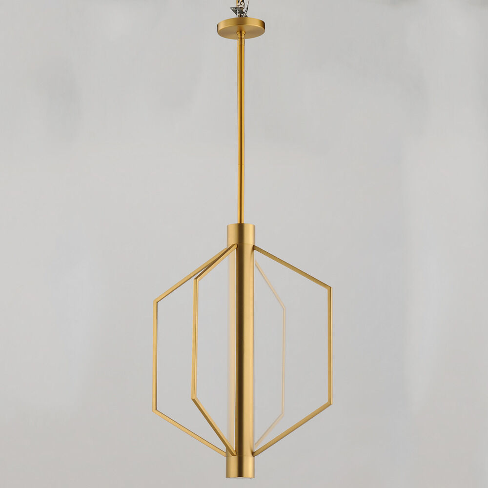 The Telstar 18-Inch Wide LED Pendant is the ideal fixture for over your modern dining room table. This pendant features a Natural Aged Brass finish, and translucent acrylic panels that are dotted to guide indirect LED strips into the body of the fixture. An additional LED bulb is recessed at the bottom of this fixture for additional downlight. The Telstar is dimmable with both ELV and Triac CL dimmers and is rated for Dry Location only.