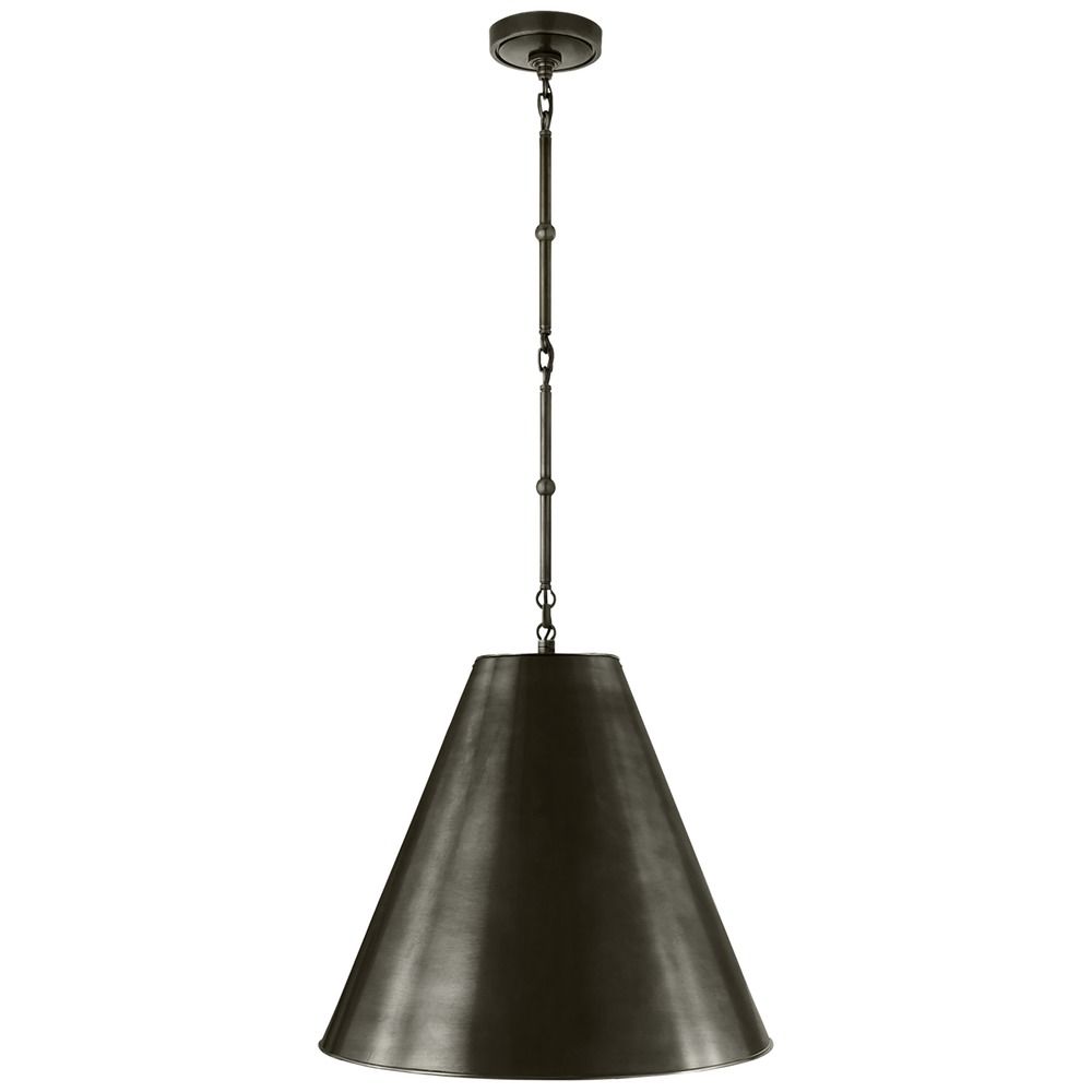 Add style to your Farmhouse-style kitchen island with Thomas O'Brien's Goodman Medium Hanging Shade by Visual Comfort. The Goodman features a Bronze conical metal shade, and a combination of stem and chain links in Bronze. This pendant requires one 100W maximum medium base A19 light bulb. It is rated for Dry Location only.