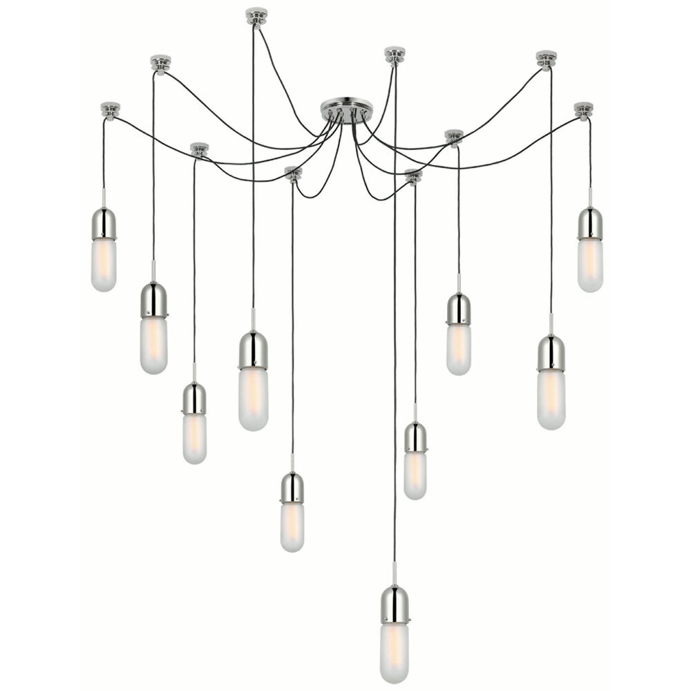 Modernize your dining room or living space with Thomas O'Brien's Junio Chandelier. This configurable chandelier features a main canopy that connects to the junction box, as well as other supports that anchor each of Junio's cables to the ceiling. At the end of each cable is a light socket and a frosted glass shade. LED bulbs sold separately.