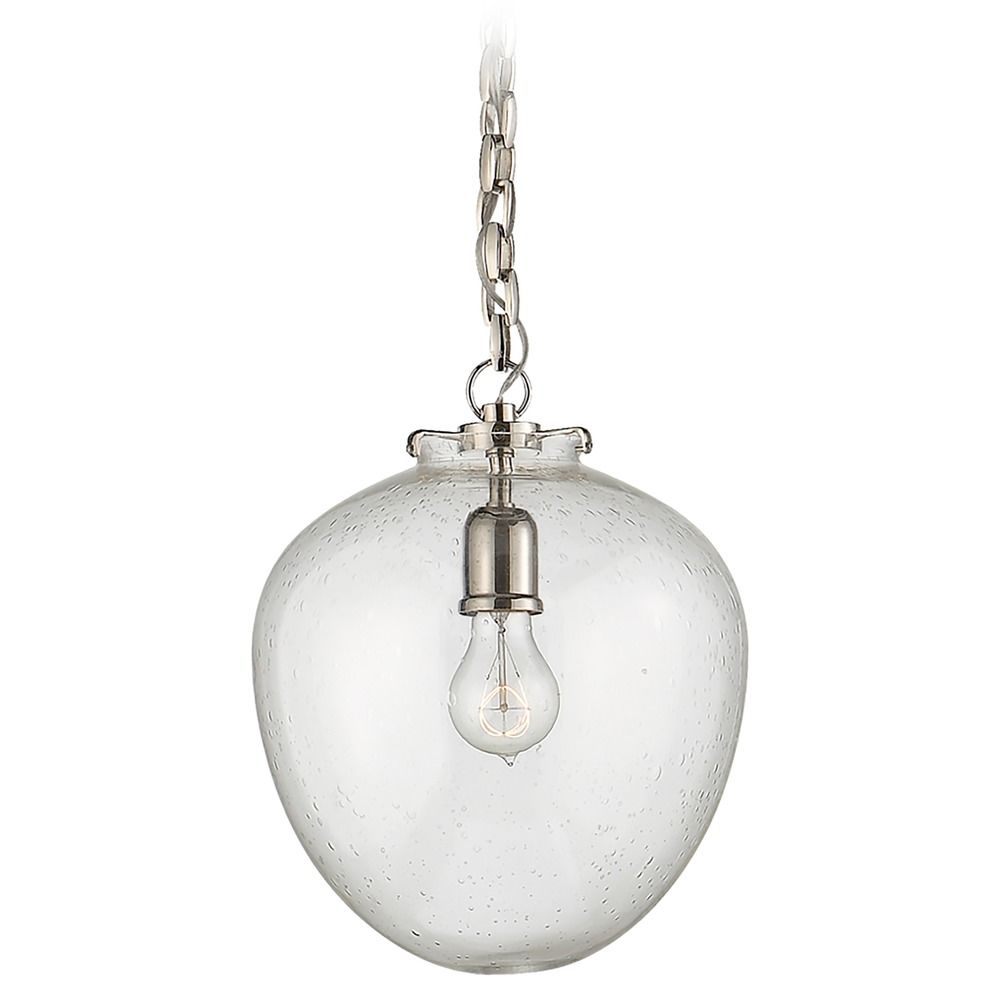 Thomas O'Brien's Katie Acorn Pendant by Visual Comfort is the ideal addition to your kitchen island or peninsula. This simple pendant works very well with Farmhouse, Industrial and even Traditional-style homes. The Katie features a Polished Nickel finish and a Clear Seeded, rounded glass. This fixture is chain hung, allowing for customization in hanging height. The Katie requires one 75W maximum medium base light bulb. A clear or vintage bulb is recommended. This pendant is rated for Damp Location.