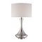 Polished steel table lamp with three-way switch and a white drum lamp shade.Takes one three-way A21 medium base bulb (not included).