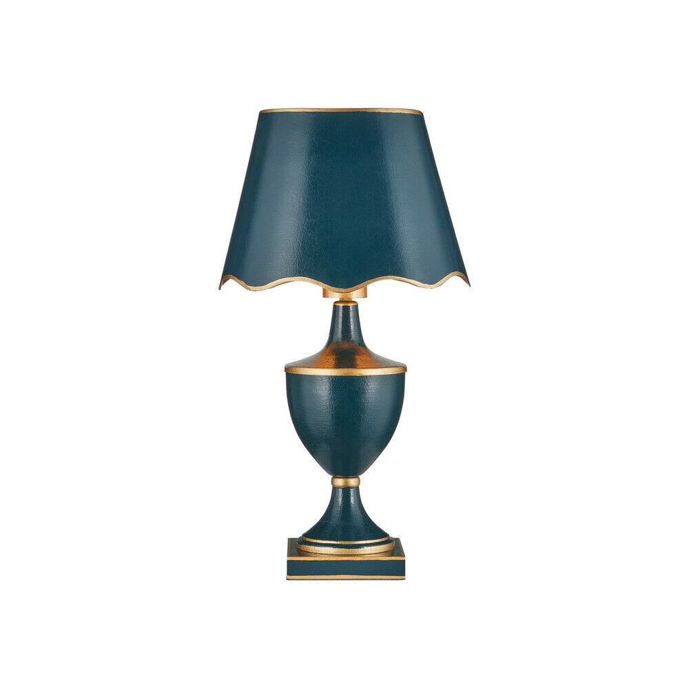 The Travelogue Cordless Rechargeable Table Lamp in Navy and Gold by Currey & Company Lighting showcases traditional tole artistry in a portable, modern format. Its classic trophy-shaped body is paired with an empire-style shade and a square base, creating a timeless silhouette finished in rich navy and warm gold tones.