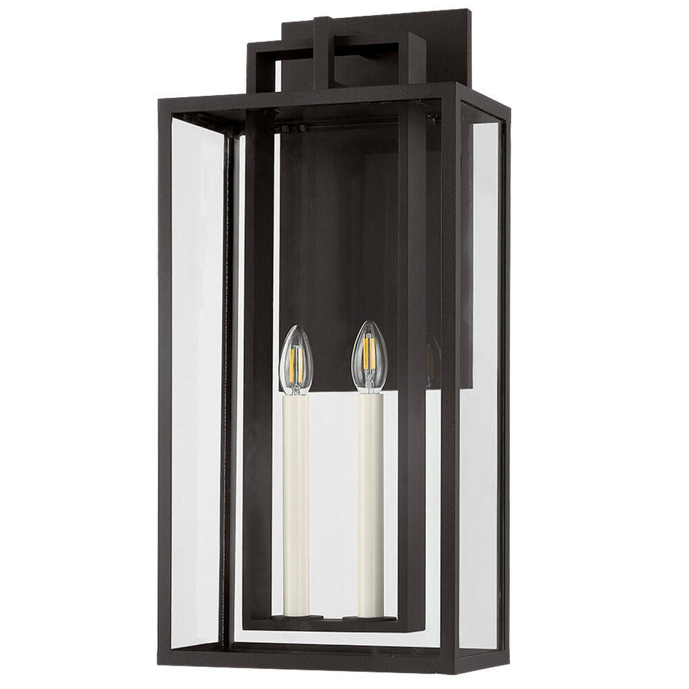 Clean lines, negative space, and a minimal rectangular backplate define the layered frame of the Amire sconce. Within the open, airy silhouette, slender off-white candles are encased by clear glass panels, optimizing illumination. The Textured Black finish brings a sense of modern elegance to any exterior. Amire is available as a 1-light sconce or a 2-light sconce in two sizes.