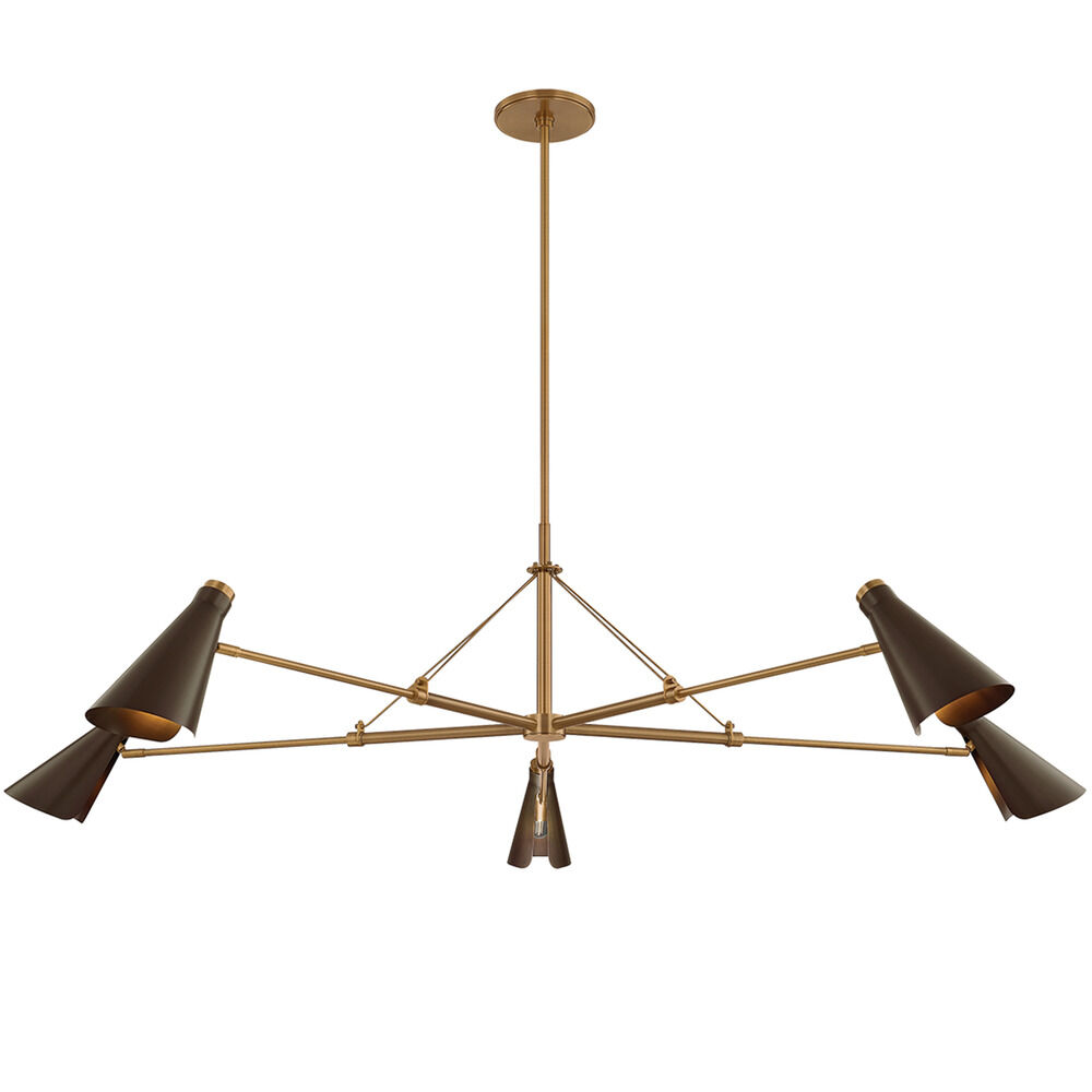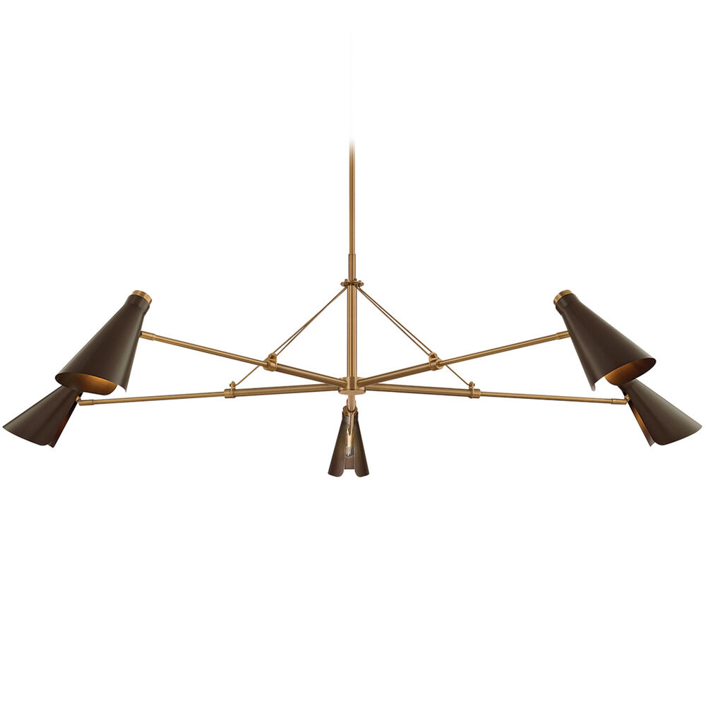 Inspired by the mid-century designs of Serge Mouille, this industrial-style family makes a statement with its sprawling yet delicate arms. Each shade features a slot for the arm to pass through, partially exposing the bulb. A mix of Patina Brass and Bronze finishes adds a sense of depth to the modern style of these fixtures. While the 1-light sconce features an adjustable arm, the 3 and 5-light chandeliers are cantilevered and reinforced by wire braces.