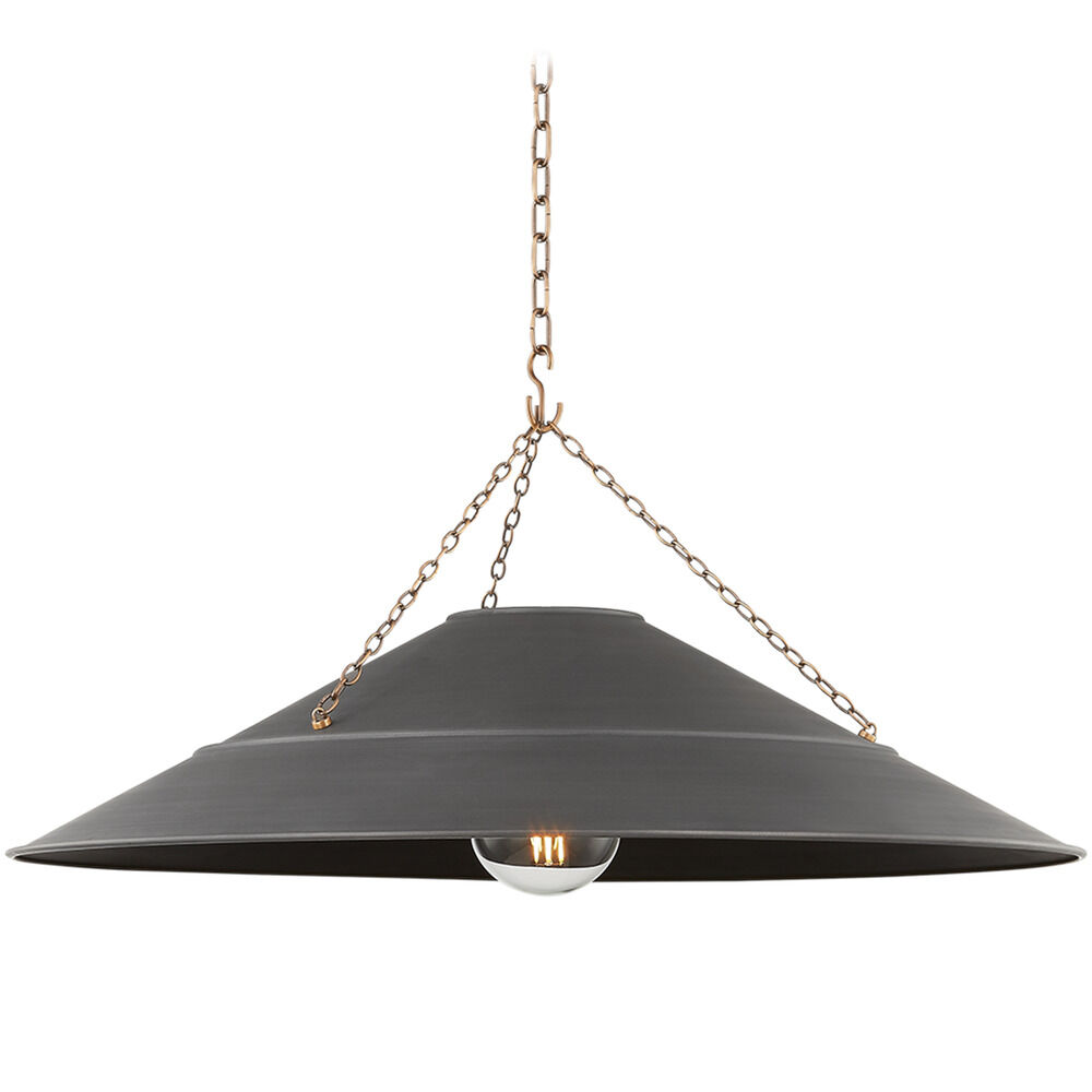 With its exposed metalwork, chain detailing, and unique finish combination, Arcane has an elevated, industrial vibe. The graphite shade feels chic and gives off a warm glow. The Patina Brass hardware, chain, and canopy add a hint of shine that plays wonderfully off the graphite. The twisted black fabric cord is a subtle detail that gives the pendant a vintage feel. Part of our Lauren Liess collection.