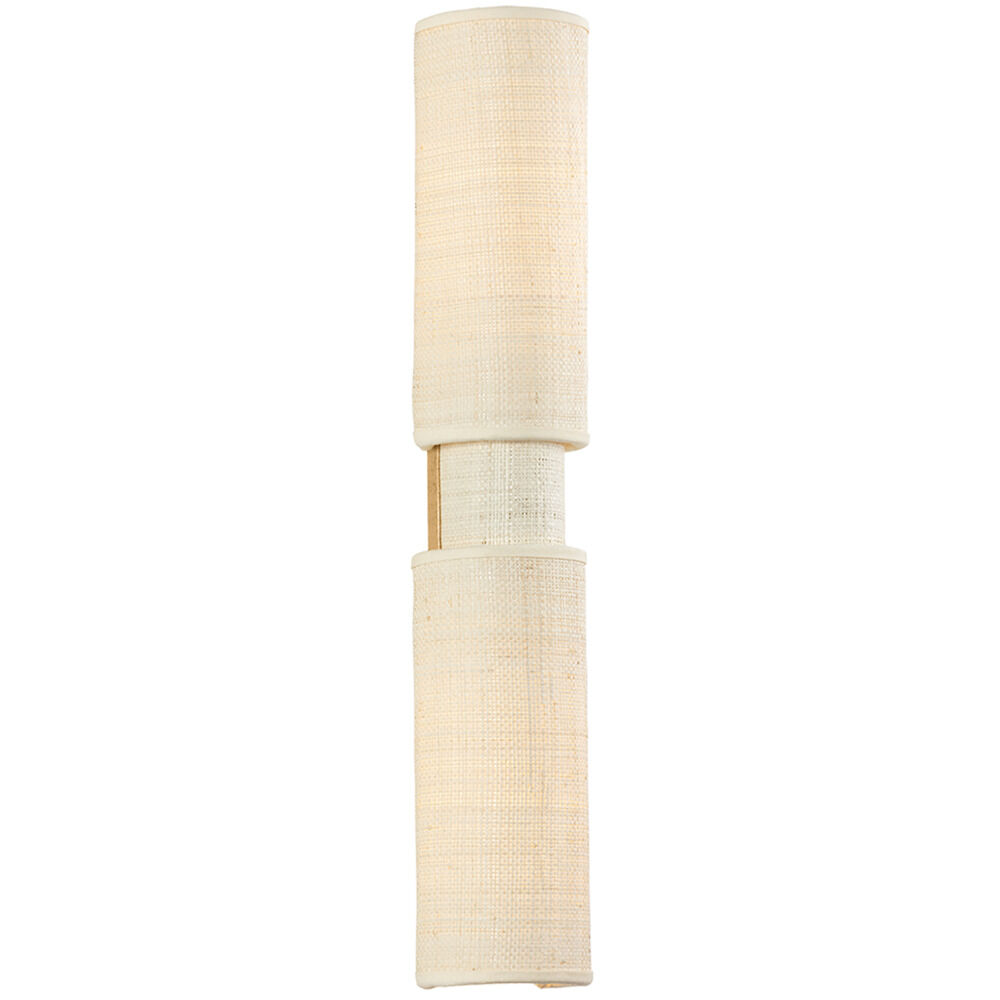The beauty of the Ashton sconce stems from its simplified form and distinctive materiality. Woven from Saguran fabric, three cylindrical shades overlap to form areas that emit more or less light. This highly textural 2-light sconce is perfect for a bathroom or other small space as it creates a serene ambience. Due to the one-of-a-kind nature of the medium, exact colors and patterns may vary slightly from the image shown.