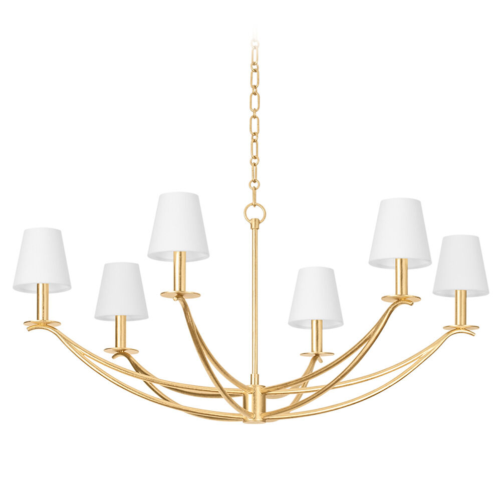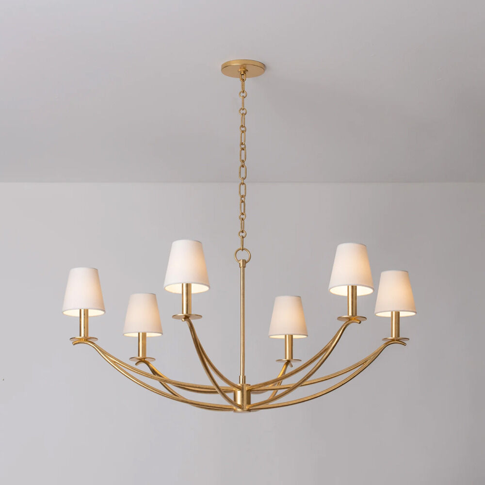 While minimalist in form, Bo features decorative flourishes rooted in heritage. The graceful arms of the chandelier swoop upwards, culminating in a delicate curl on which each candle rests. Tapered white linen shades provide a sense of tailoring while the Vintage Gold Leaf finish feels fresh and upscale.