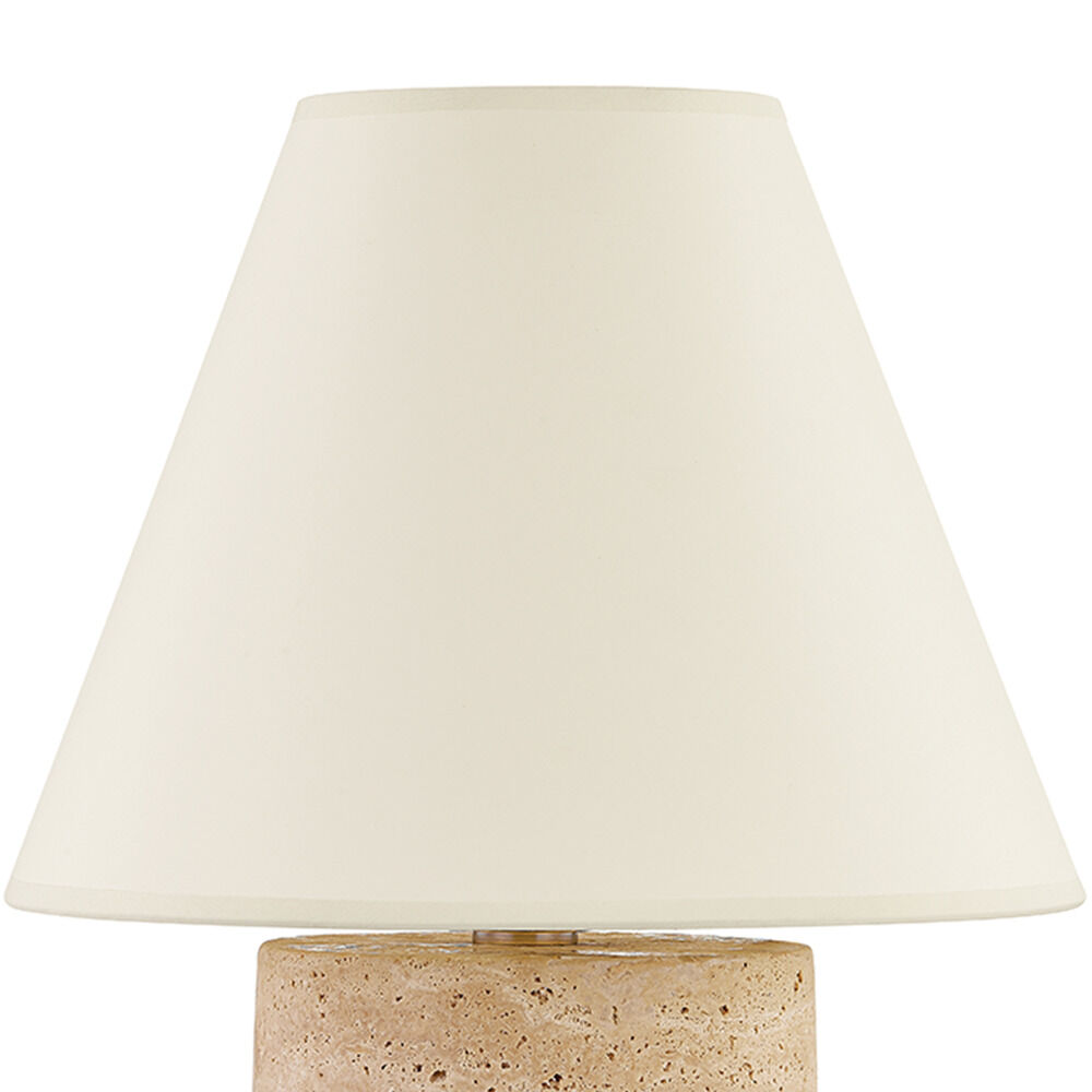 A tapered paper shade beautifully frames Bronte's natural travertine base, directing light down and around to highlight its organic texture and markings. A Patina Brass accent gives this earthy table lamp a hint of sophisticated detailing.Due to the one-of-a-kind nature of the medium, exact colors and patterns may vary slightly from the image shown.