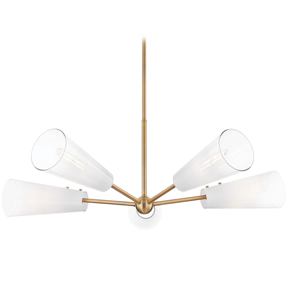 Slender Patina Brass arms hold tapered Sfumato glass shades creating a simple, modern silhouette. The Sfumato glass has an ombre effect, starting out smoky white and gradually fading to clear, hiding the lamping inside and casting both a soft glow and a clear bright light. Both the sconce and the chandelier are large in scale, making a big impact on the wall or ceiling.