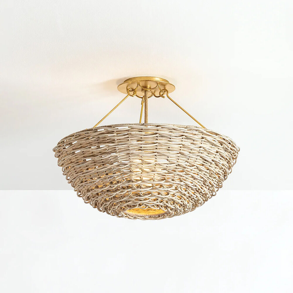 Woven in a unique scalloped pattern, the whitewash rattan of Campo makes for a highly textural and beautiful flush mount shade. The loose weave allows light to radiate through the negative space, casting mesmerizing lighting effects on the walls and ceiling. Vintage Gold Leaf metalwork supports the fixture, adding a touch of shine. Due to the one-of-a-kind nature of the medium, exact colors and patterns may vary slightly from the image shown.