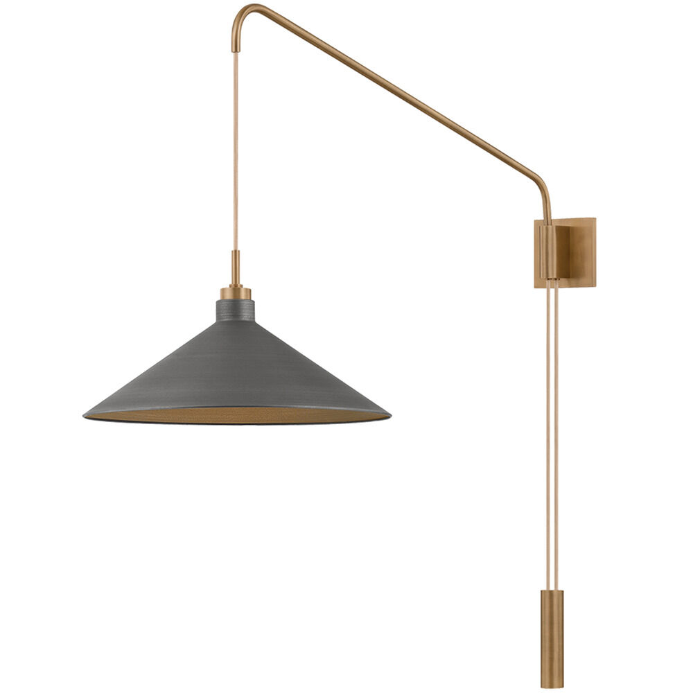 Pulling from elements typically seen in pendant designs, this oversized 'rise and fall' sconce is an engineering marvel. A mid-century RLM-style shade is paired with a minimalist cylinder counterweight to create visual balance. The Patina Brass finish complements the Graphite shade and Taupe Cloth Cord while adding a layer of dimensionality to the industrial silhouette.