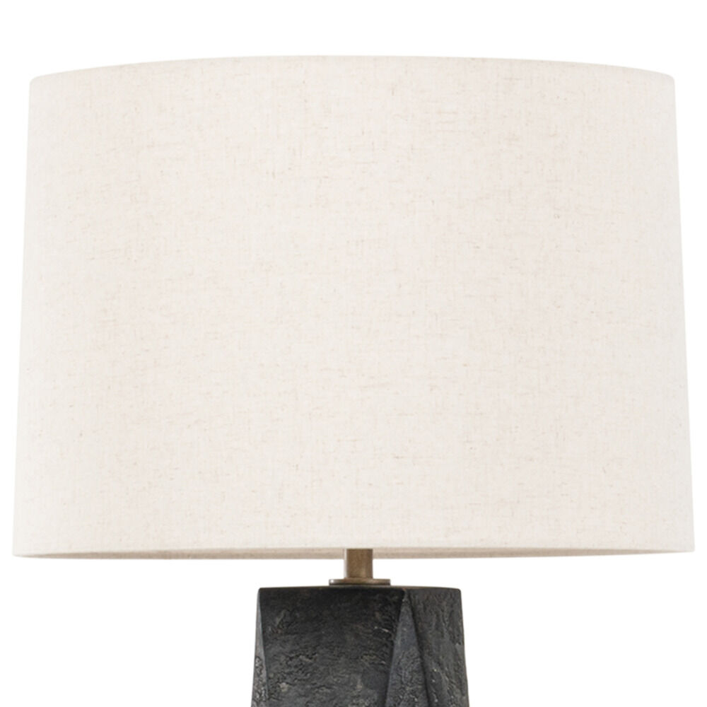 A geometrically faceted lamp with a primitive, hand-hewn quality, Coronado has the appearance of a modern sculpture carved from stone. The chalky finish of the black ceramic is balanced by the freshness of a natural grained off-white linen shade. A subtle glint of Patina Brass metalwork introduces a warm note at the neck. Due to the one-of-a-kind nature of the medium, exact colors and patterns may vary slightly from the image shown.