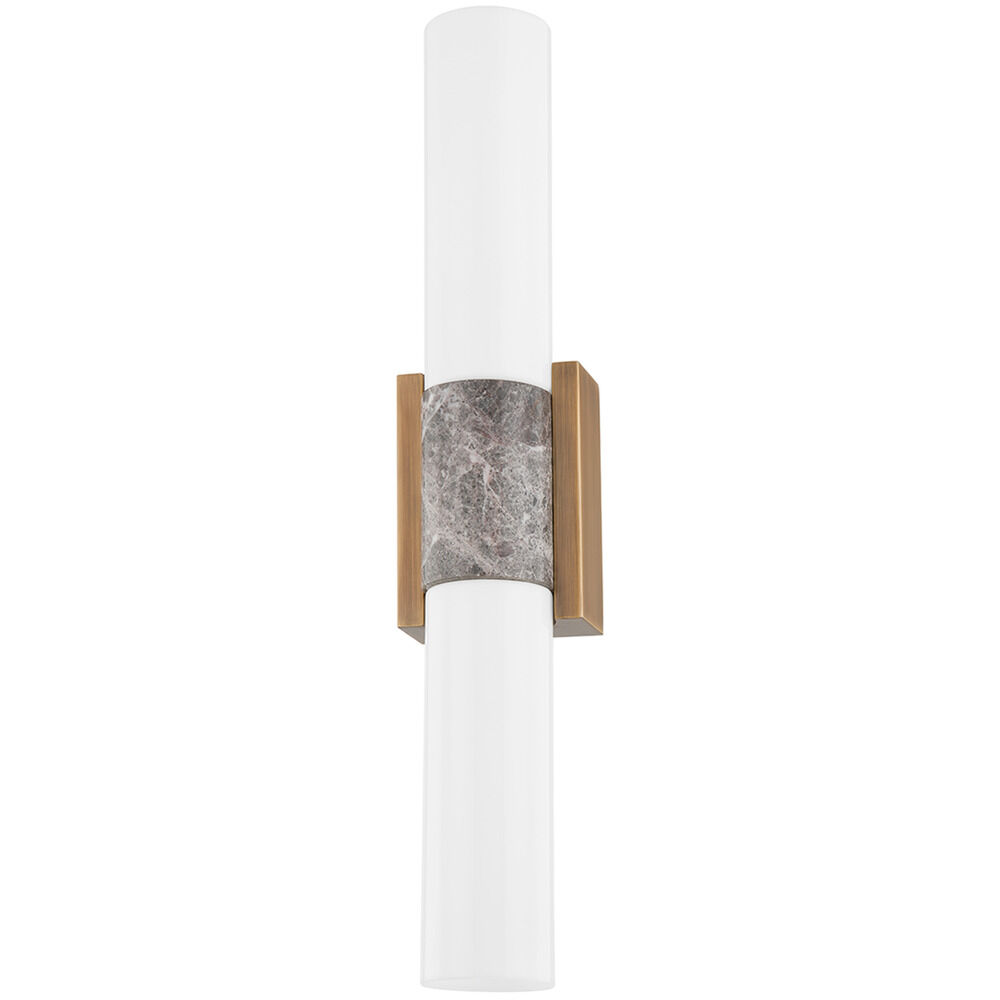 A cylindrical opal glossy glass shade with a band of grey marble is held in place by a protracted backplate of Patina Brass making Fremont feel unexpected and sophisticated. This wall sconce has a different yet designer aesthetic that makes it usable and unique at the same time. The two-light sconce can be mounted vertically or horizontally. Due to the one-of-a-kind nature of the medium, exact colors and patterns may vary slightly from the image shown.