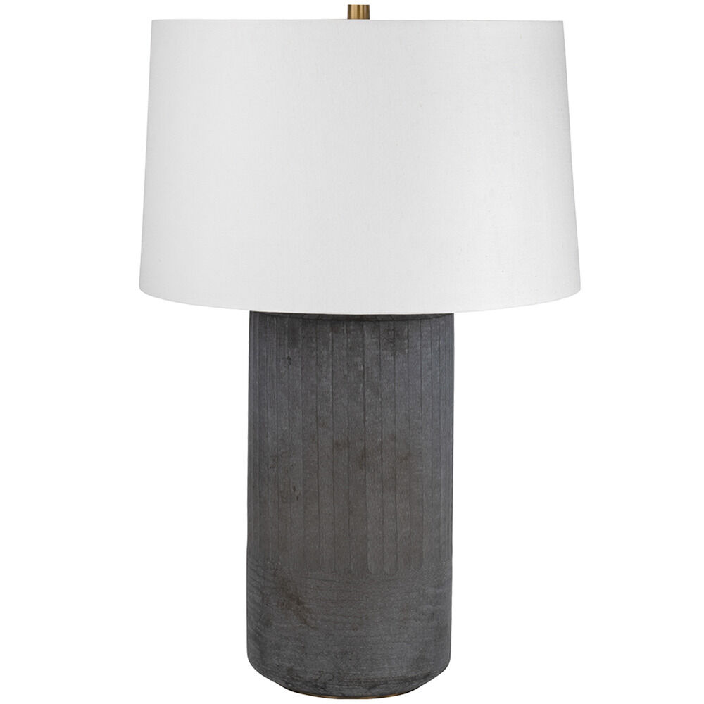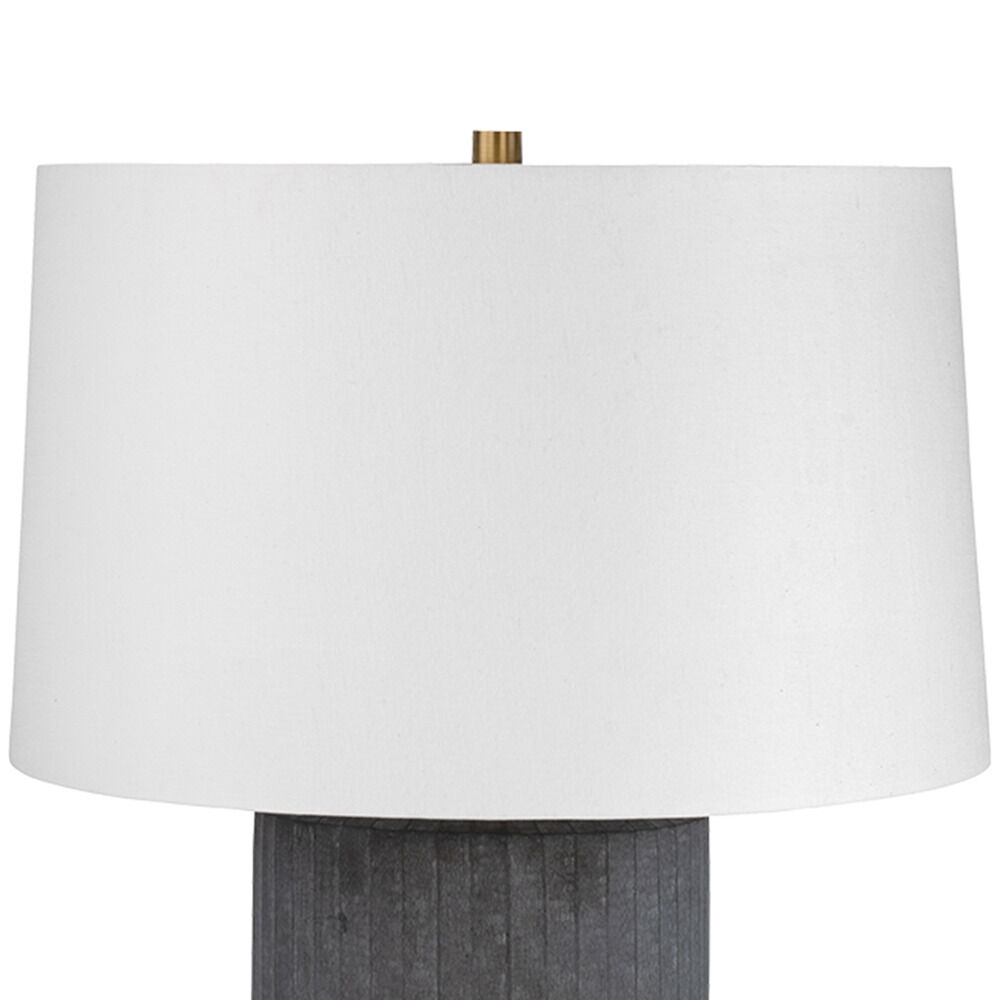 The minimalist silhouette of the Greyson table lamp is elevated through the use of traditional Indian cut glass techniques. The cylindrical glass base features a dark, moody palette with intricate faceting that adds subtle texture. Topped with a large white linen shade, this sophisticated staple is designed to subtly enhance any room. Due to the one-of-a-kind nature of the medium, exact colors and patterns may vary slightly from the image shown.