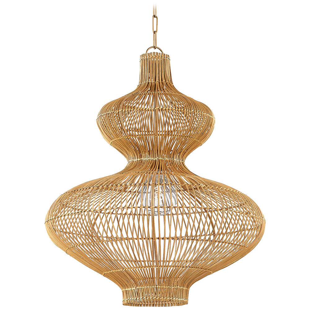 Embodying a sense of refuge, warmth, and reprieve, the Irvine pendant recalls a traditional Vietnamese hanging lantern with a modern, sculptural twist. Featuring two tiers of rounded shapes that cinch in the center, the balanced silhouette appears to gently undulate overhead. The loose rattan weave allows light to sift through, casting a warm and inviting glow throughout a space. Suspended from a bronze chain, Irvine creates an elevated lighting experience. Part of our Chandler McLellan collection.