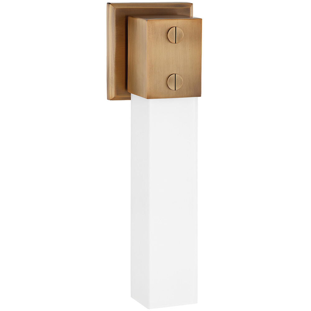 Jonah is the epitome of soft industrial design. The clean lines and defined shape of the sconce body are softened by the acid-etched glass and the beautiful jewelry-inspired hardware on the holder. The coordinating square backplate adds to this stylish sconce's fresh feel. Choose from a one- or two-light option in patina brass or polished nickel.