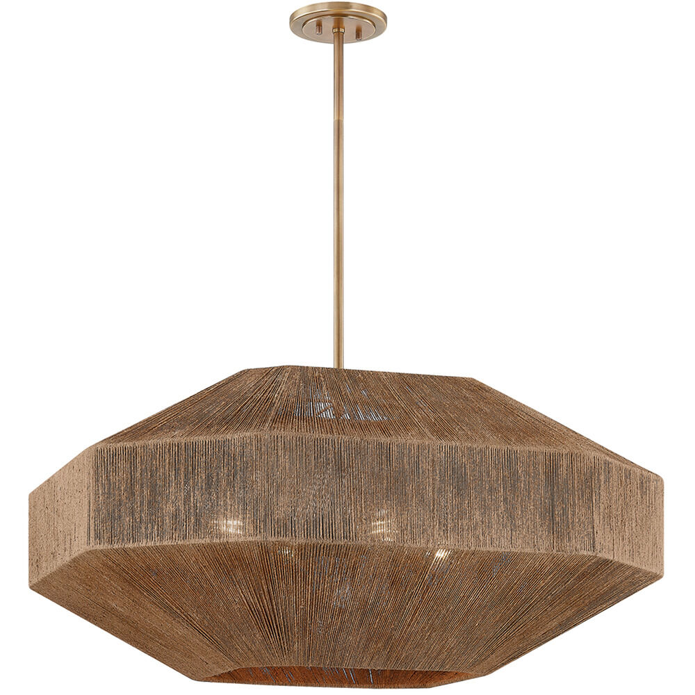 Designed to make an impact on large ceilings, Laken features a voluminous architectural shade. The artisanal jute-wrap technique gives the fixture its rich texture and warm color variance. Inside, a pinwheel cluster of lights emits powerful illumination. Laken is finished with Patina Brass metalwork, adding an antiqued quality that complements the rustic nature of the jute. Due to the one-of-a-kind nature of the medium, exact colors and patterns may vary slightly from the image shown.