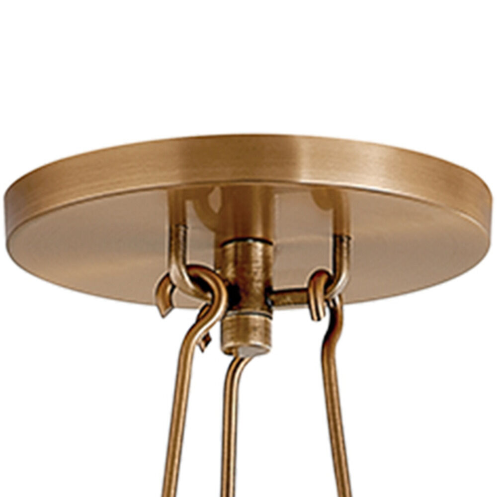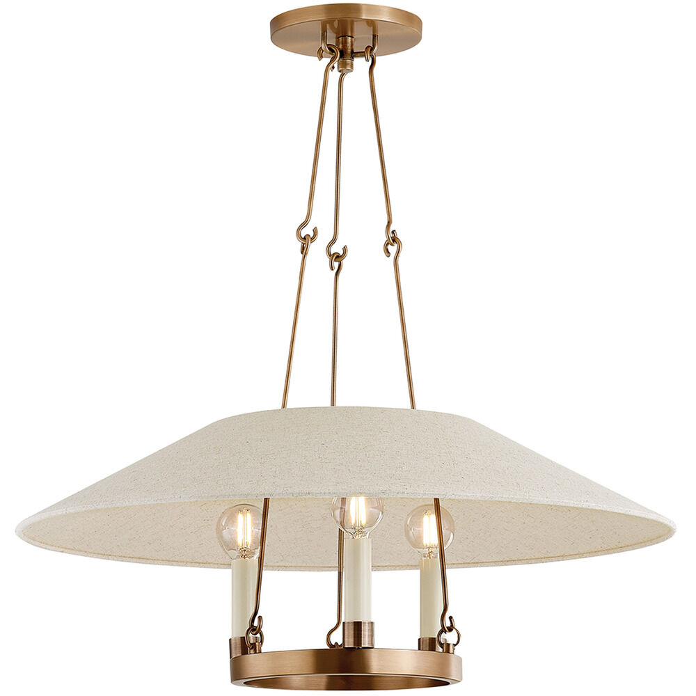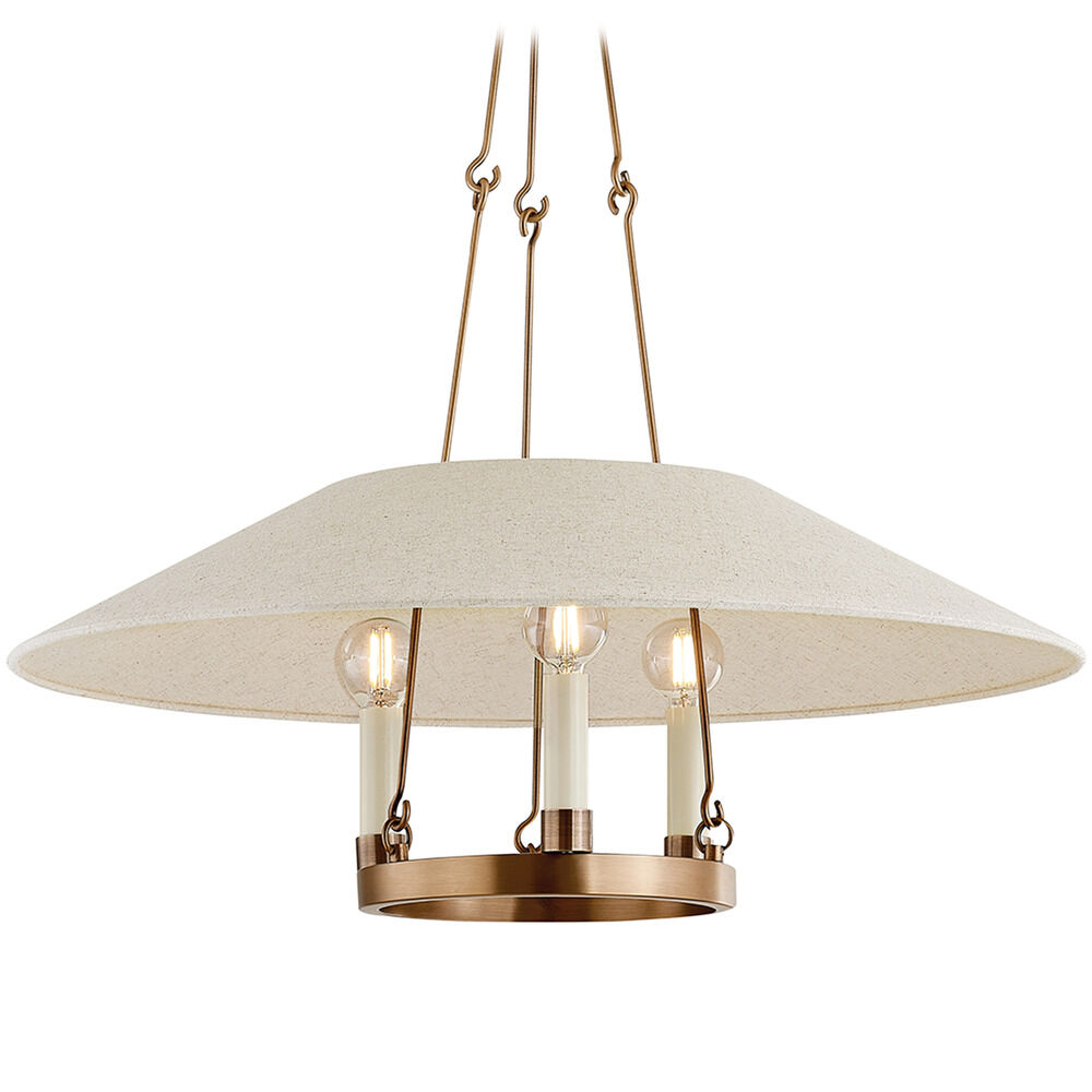Archive reimagines the traditional ring chandelier. A trio of candles are displayed around a metal ring held aloft by delicate hooked arms. The natural linen shade over the framework is unexpected and adds an organic feel and a soft light. Make a sophisticated statement overhead with the Bronze finish or bring a warm glow to the ceiling in Patina Brass. Part of our Lauren Liess collection.