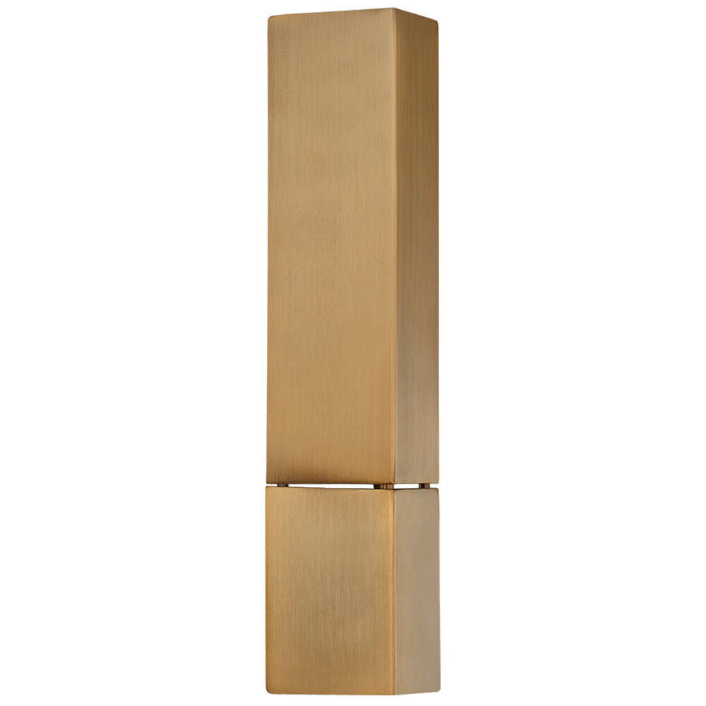 Defined by its vertical planar design, the minimalist Lehi sconce creates a soft glow in small spaces. Its folded, enclosed shape directs light emission at the wall, muting the glare to create a tranquil experience. Enhanced with integrated LED and finished in Patina Brass, Lehi is ideal for smaller spaces like hallways and bathrooms.